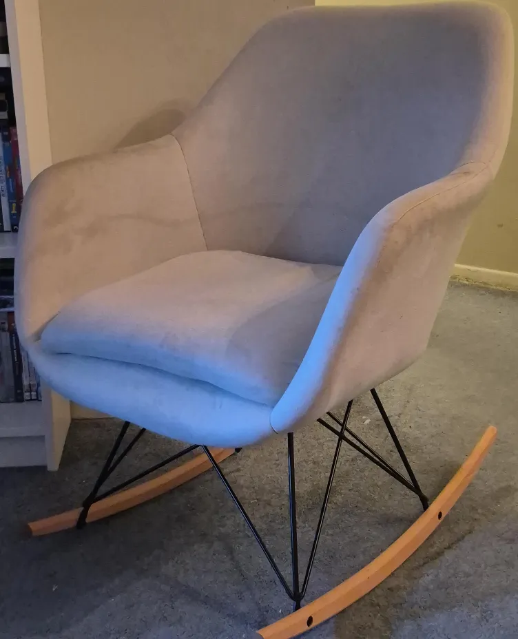 It's in great shape and would be perfect for a nursery or living room. The chair features a soft, neutral fabric and a sturdy rocking base. The fabric does have visible stains, but the structure is still solid. Easy to clean or reupholster.