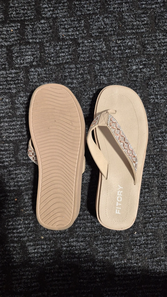 Cute pair of Fitory flip flops! They are beige with a sparkly strap. Perfect for summer! cash only please.