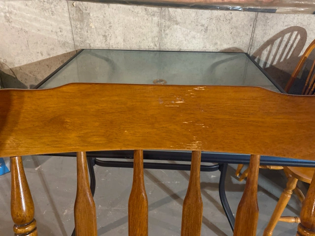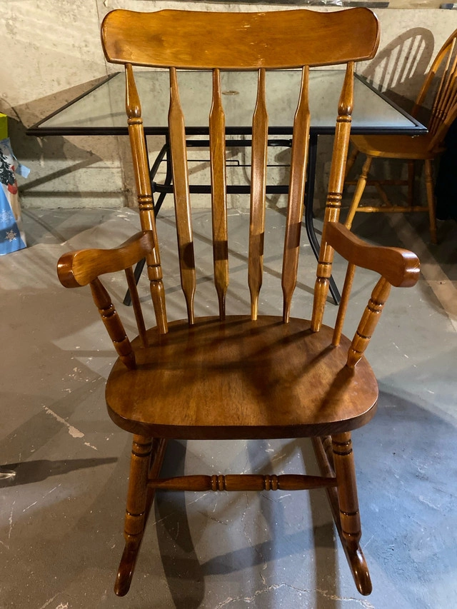 This is a charming solid wood rocking chair, perfect for adding a touch of warmth to any room. The chair features a classic spindle back design with comfortable armrests, making it ideal for relaxation. This rocker has a warm finish, highlighting the natural beauty of the wood. As a previously enjoyed piece, it shows some signs of wear, which only adds to its character. If the ad is up, it's available!