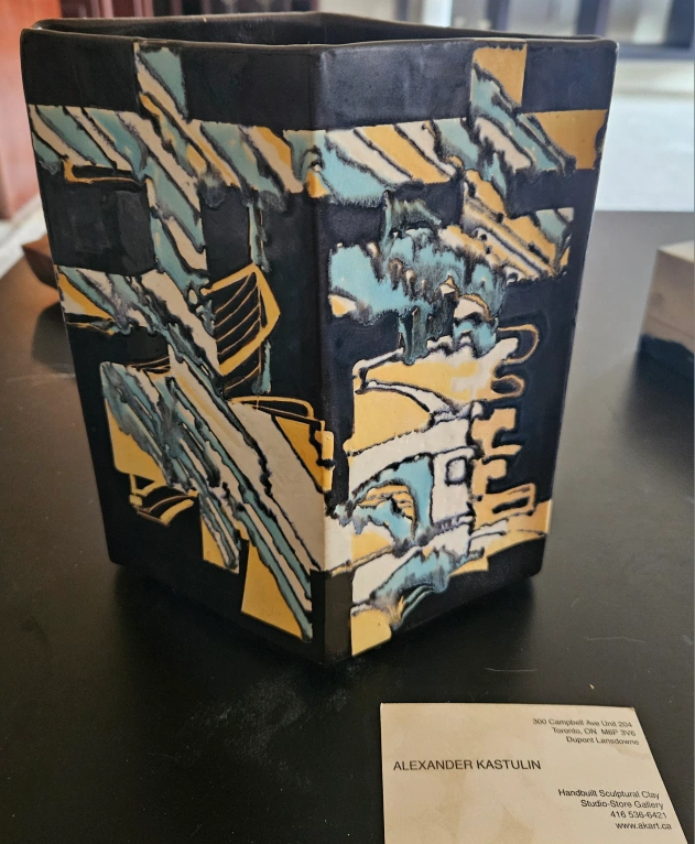 Selling a unique handbuilt sculptural clay vase by Alexander Kastulin. This piece features a striking design and would make a great addition to any home or studio gallery. It was purchased from the Studio-Store Gallery at 300 Campbell Ave Unit 204, Toronto.
