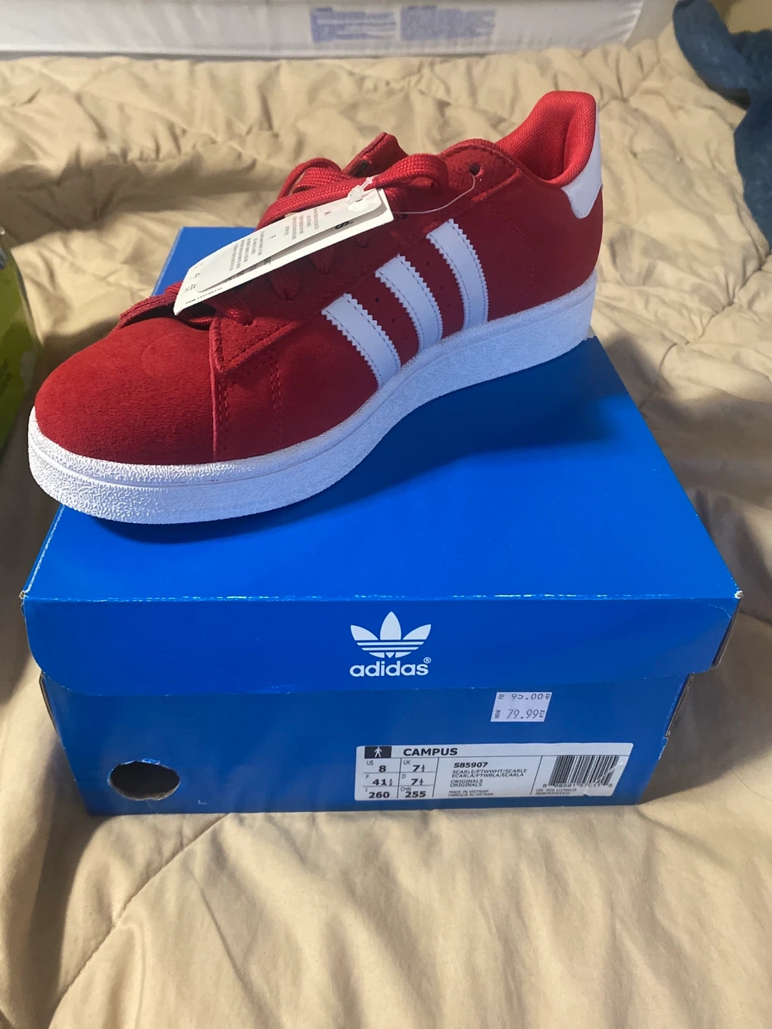 Selling a pair of Adidas Campus sneakers in red with white stripes! They are a size 8 US. The box is included and shows a price of 79.99.