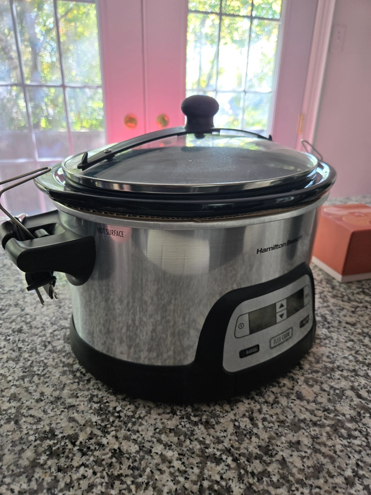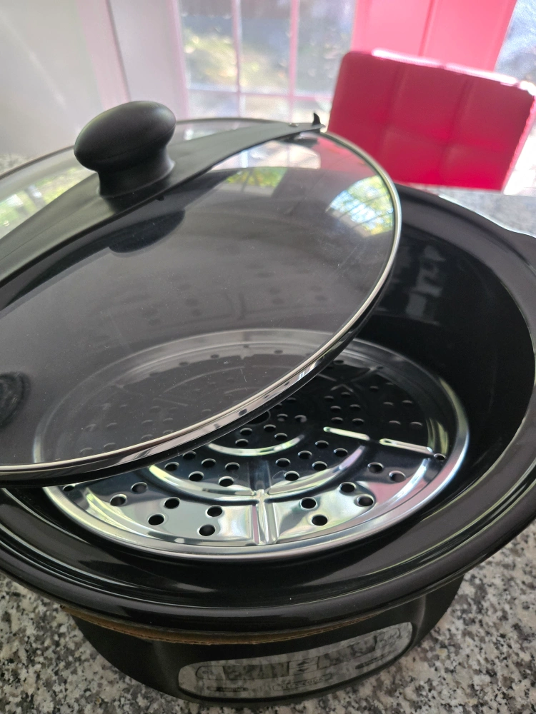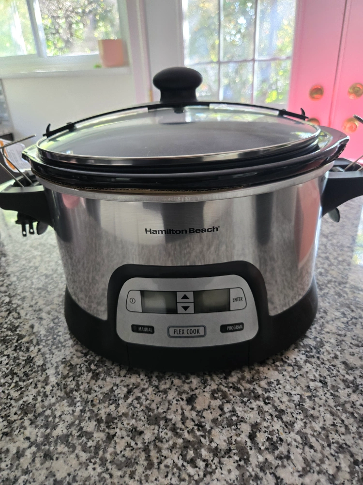 I'm selling a Hamilton Beach FlexCook slow cooker in great condition. It comes with a lid and a steaming rack. Perfect for making soups, stews, and other delicious meals!