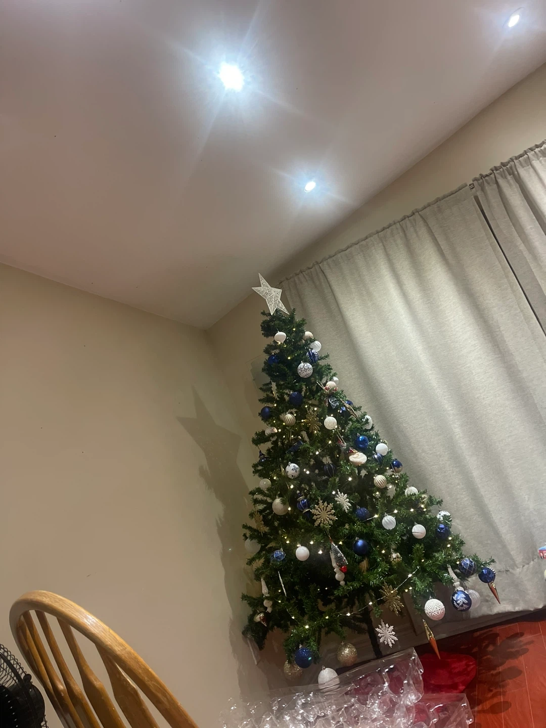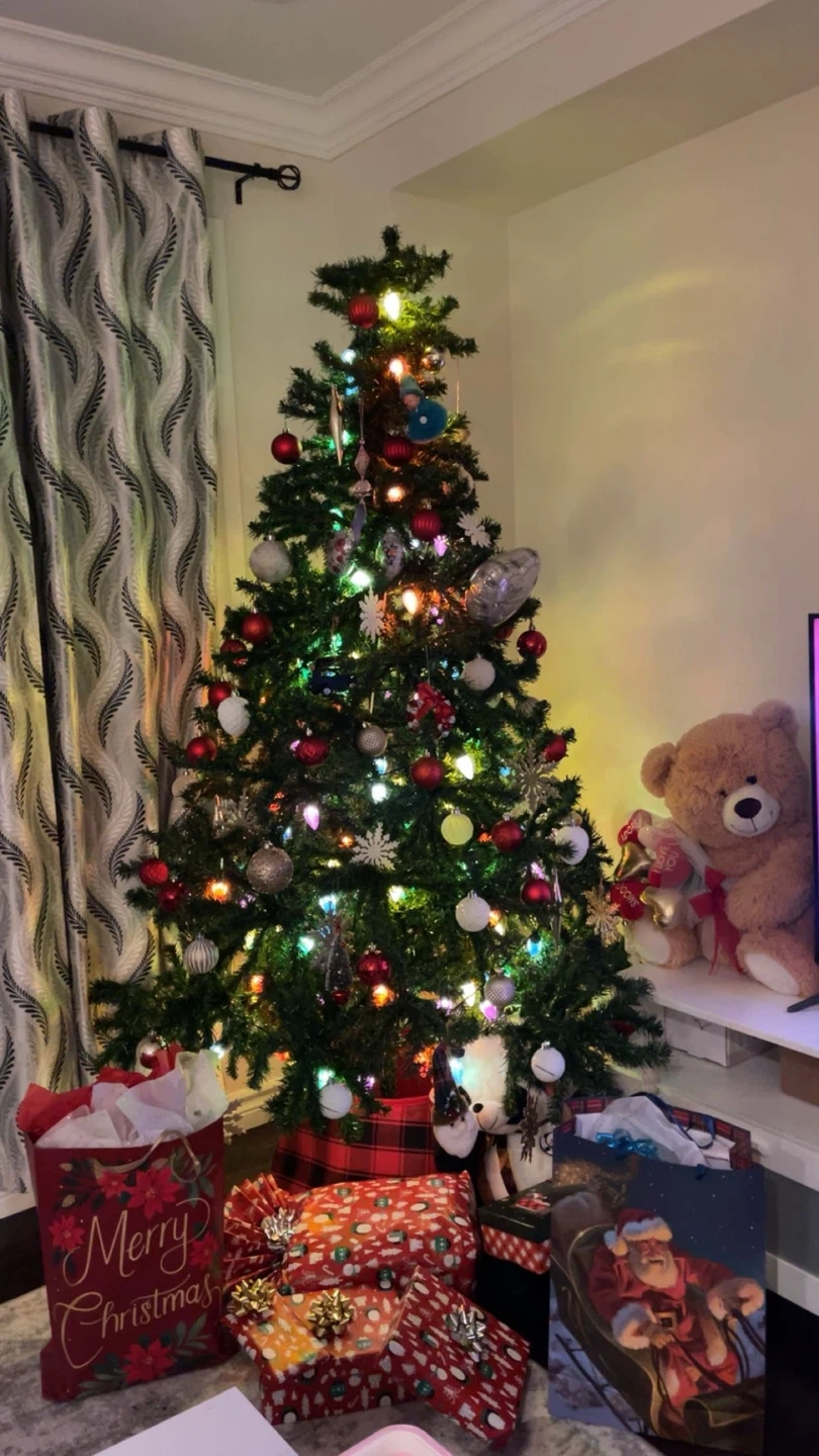 Selling a Christmas tree and box full of ornaments. Number of ornaments are 50 and more. All are used just once very good quality with hooks to put it on tree. It comes with a variety of blue, white, and silver ornaments, plus a star for the top (you can see in pic 2 and 3) and good quality tree basket. Tree is 9ft tall. Ornaments are one on the tree in these picturee except red onse and first picture has the tree basket too.