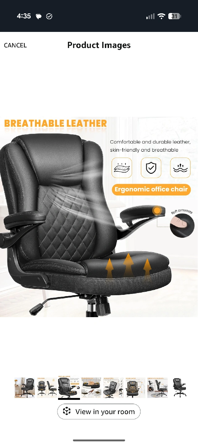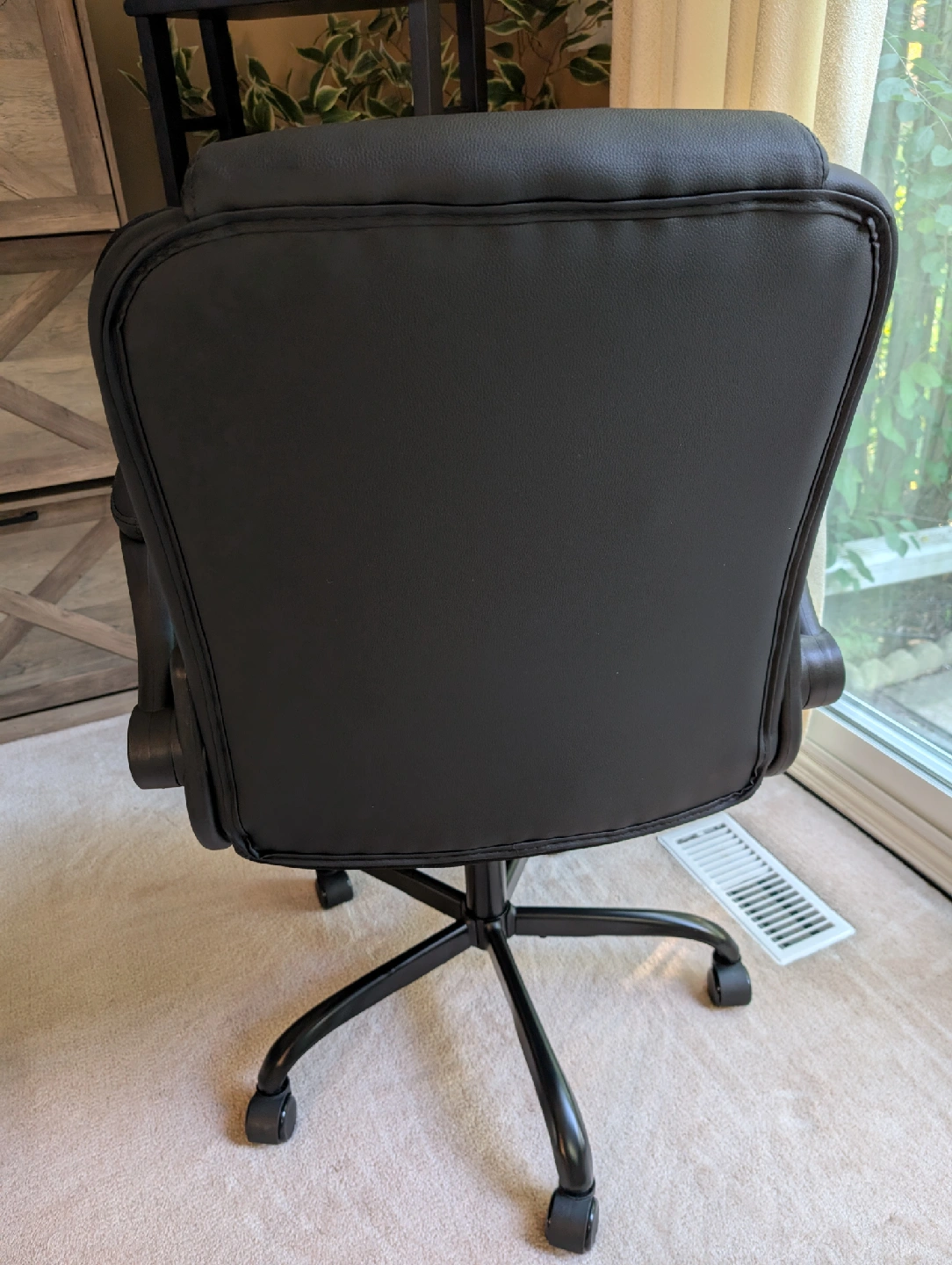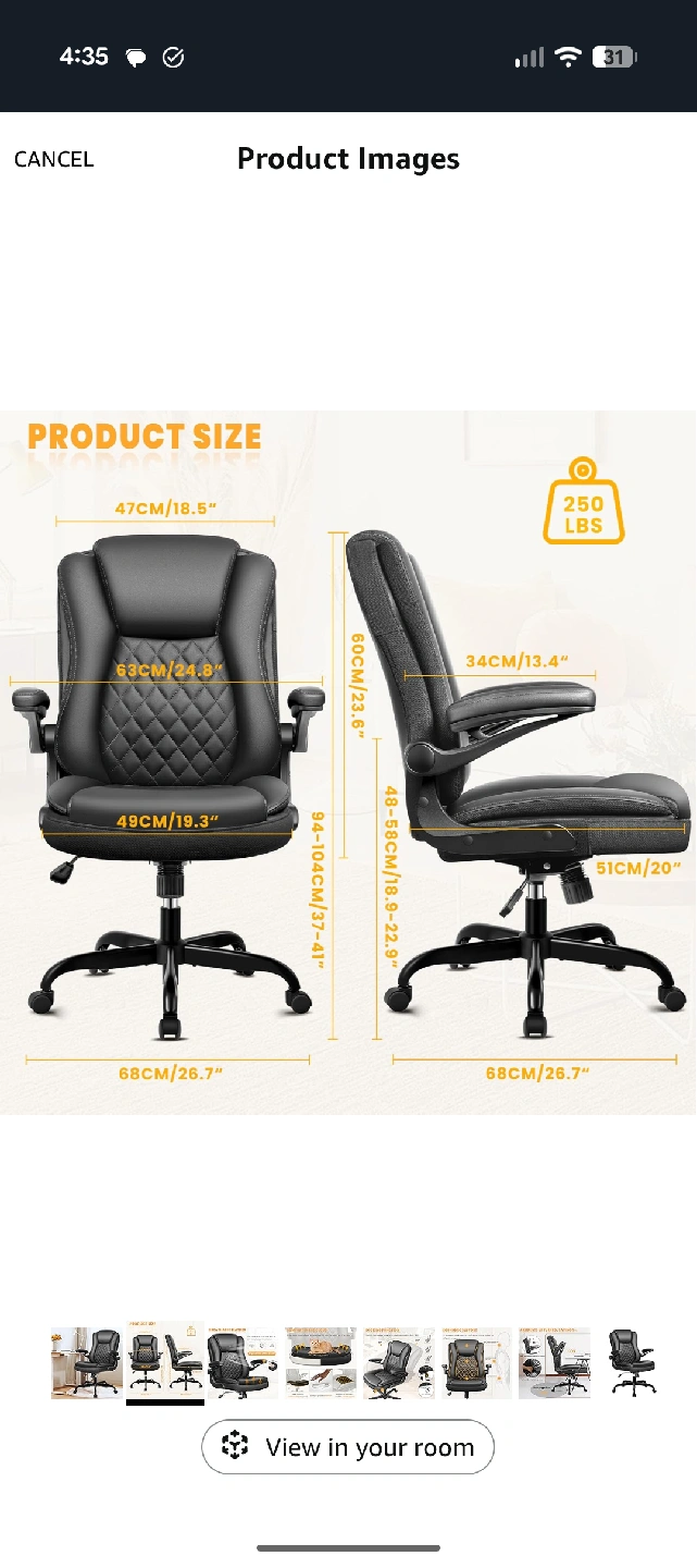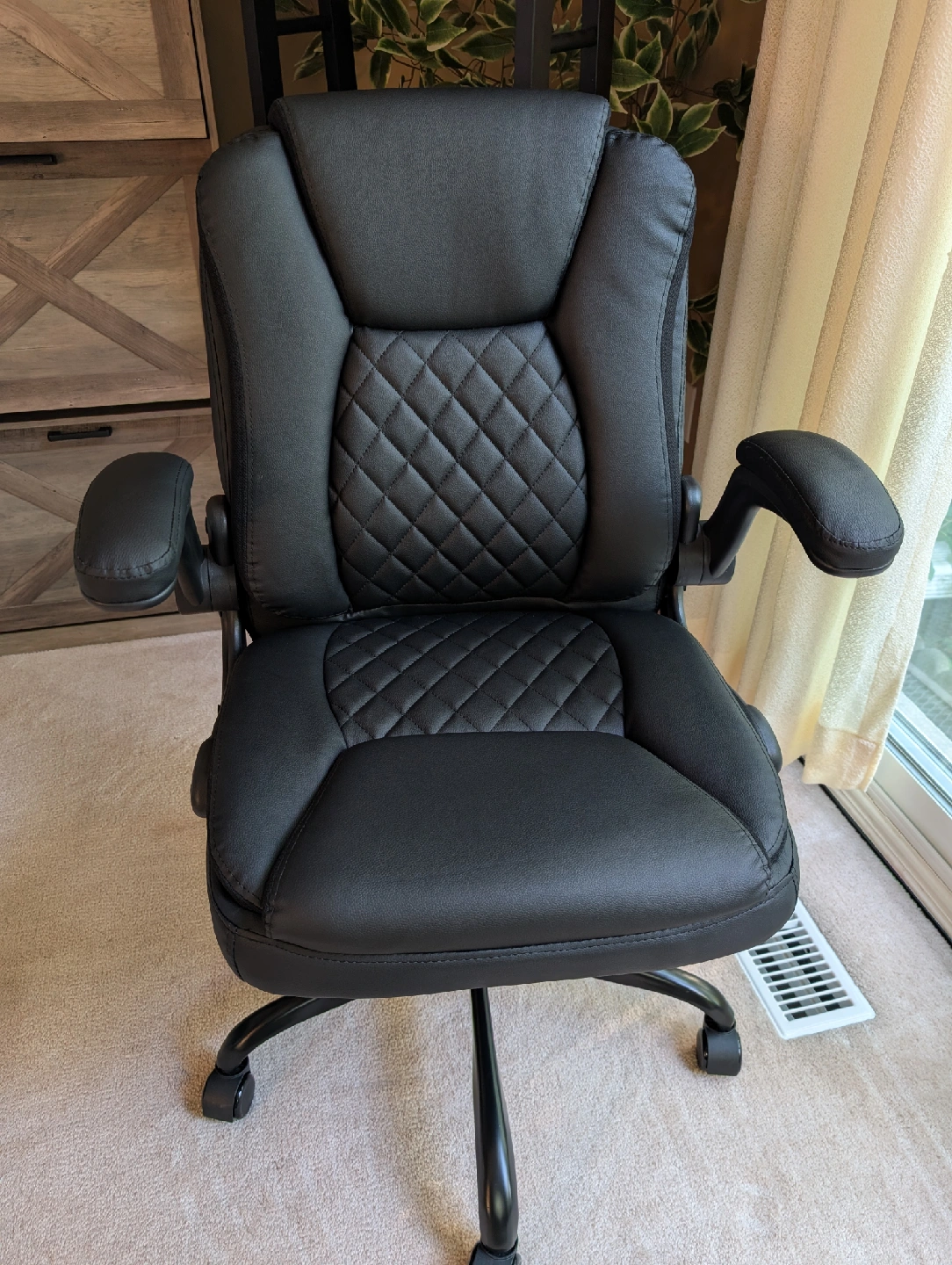 Looking to sell this ergonomic office chair! It's a comfortable and durable leather, skin-friendly and breathable option for your home office setup. It also has soft armrests for extra comfort. The chair measures 47cm/18.5" wide and 60cm/23.6" high.