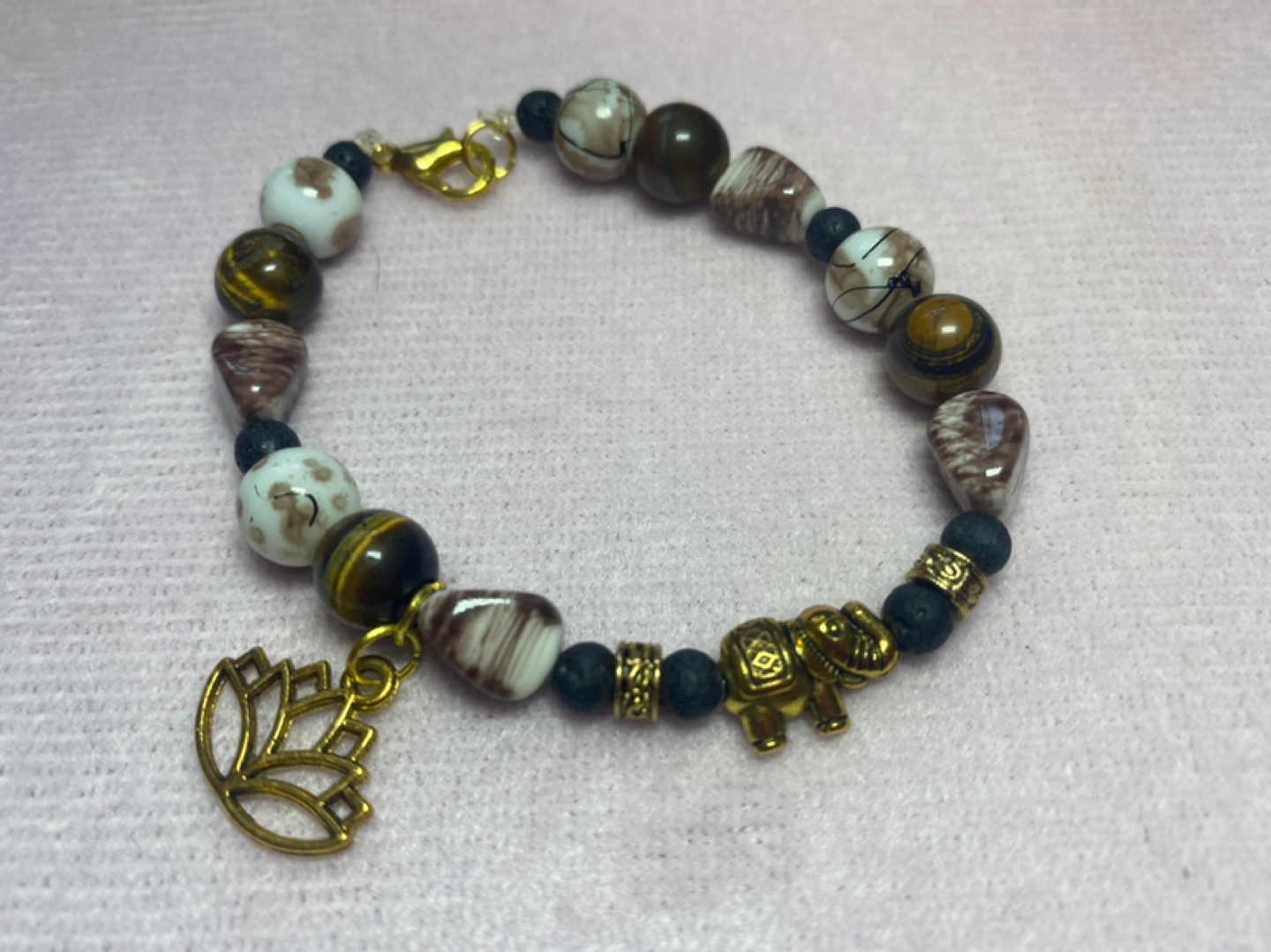 Crafted with tiger eye stones, crackle glass beads, yoga and elephant pendant as well as lava rock beads defused in essential oil’s for healing