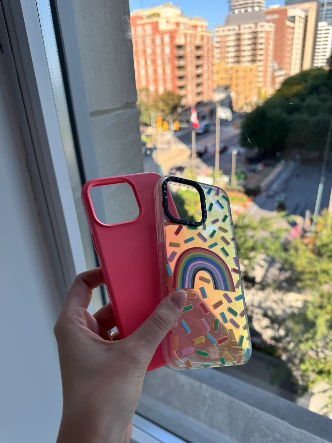 Selling two Casetify iPhone cases. One is a solid pink colour and the other is clear with a rainbow confetti design. They're in great condition and ready for a new home!