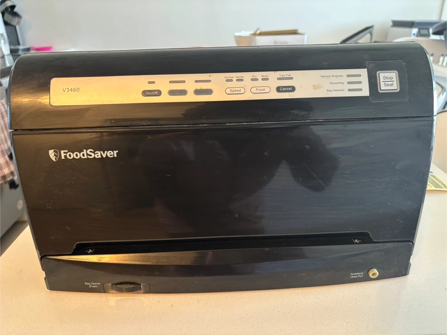 Selling a FoodSaver V3460 vacuum sealer. It has settings for normal, gentle, dry, and moist foods. There's also a tray full indicator and vacuum progress lights. It comes with sealing bags also.