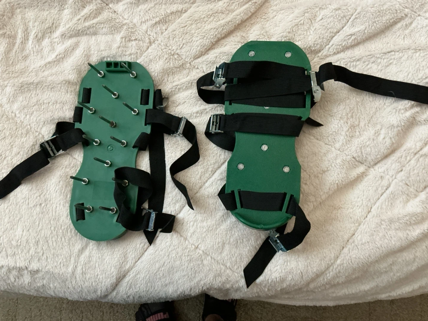 Get ready to give your lawn some love with these lawn aerator spike shoes! They're green and feature adjustable straps to fit your feet. These shoes are designed to help aerate your lawn as you walk, promoting healthier grass growth. They are in great condition and ready to use!