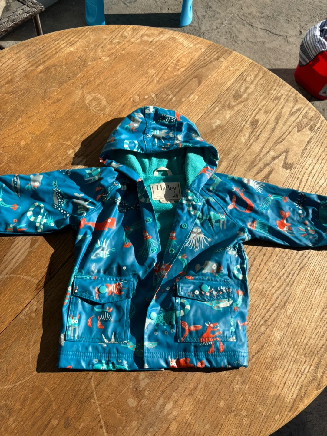 This adorable Hatley raincoat is perfect for keeping your little one dry on rainy days! It features a fun sea creature print in vibrant blues and oranges. Size 2.