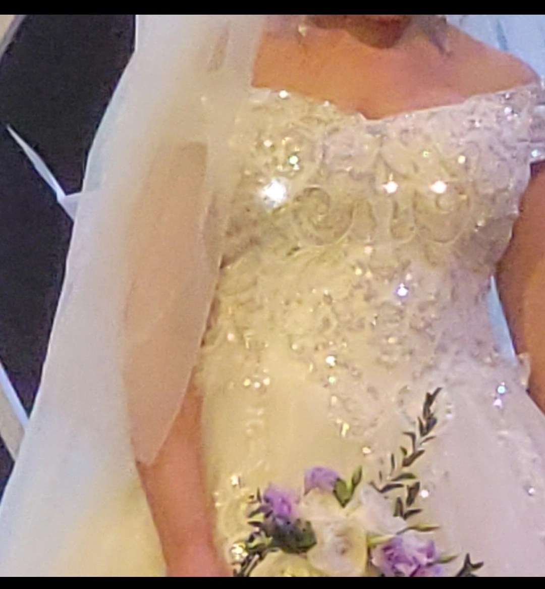 this wedding dress is a beautiful and gorgeous dress.... with a beautiful long trail.... the dress is clean .... selling bc I'm married and no use for it anymore..... 🤪 I'm sure it will make the next bride even more beautiful and happy... I purchased this last year 2024feb.... if you need more pics pls message....$1000 you won't find a dress like this price..comes with petticoat underskirt... I'm a medium wedding dress I wear is 10 but anyone whose a small would fit as well.... it's been washed ..