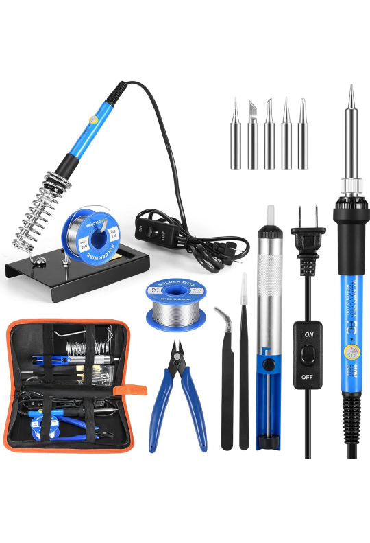 Soldering Iron Kit Electronics, 60W Soldering Welding Iron Tools with ON-Off Switch, 5pcs Soldering Iron Tips, Solder Sucker, Soldering Iron Stand, Tweezers, Solder Wire, Wire Cutter, PU Carry Bag.