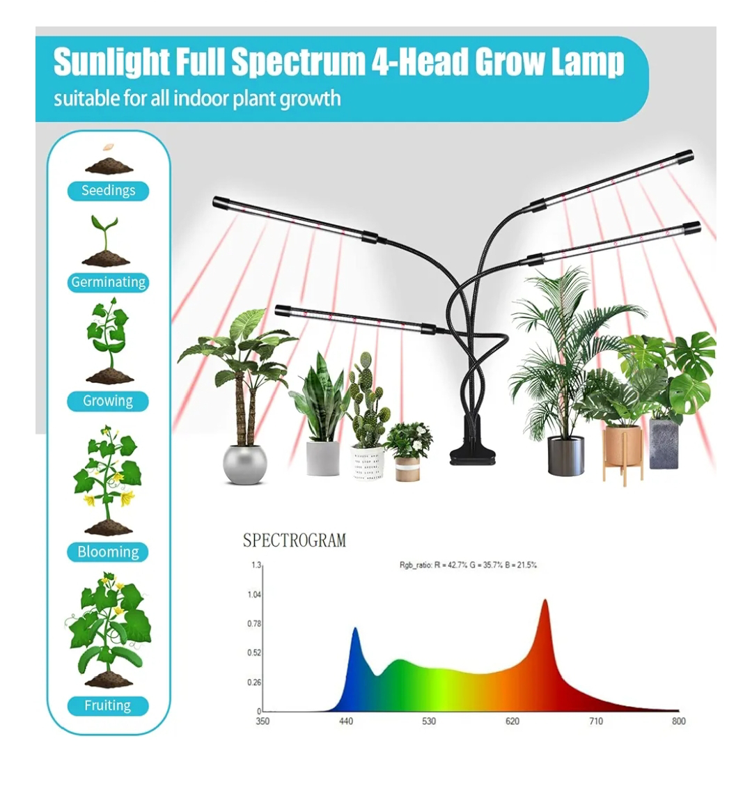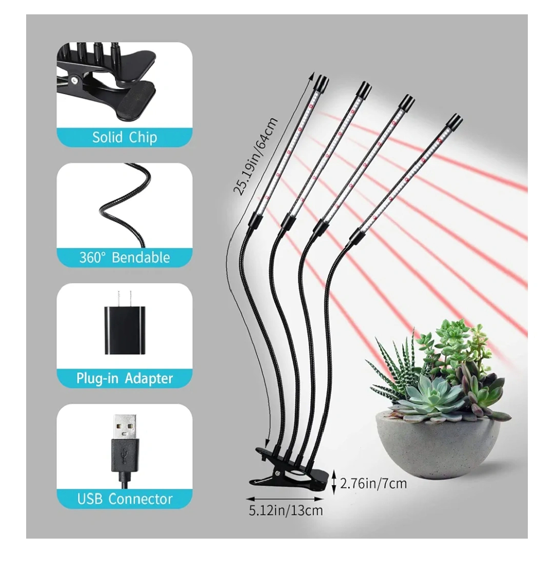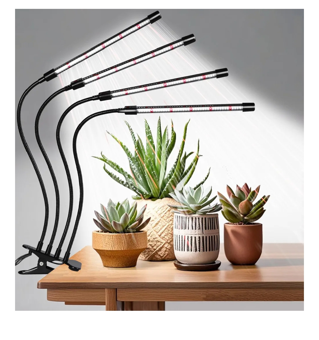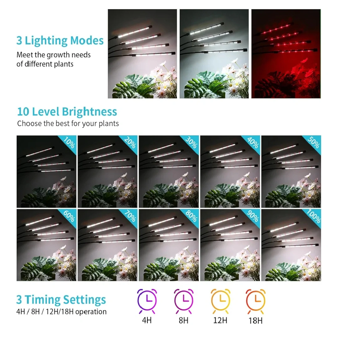 Black Clip Grow Lights for Indoor Plants, 168LEDs Full Spectrum Red White Light Clip Plant Growing Lamps with Flexible Gooseneck and 4/8/12/18H Timer, 3 Spectral Modes, 10 Dimmable Levels, 4 Head.