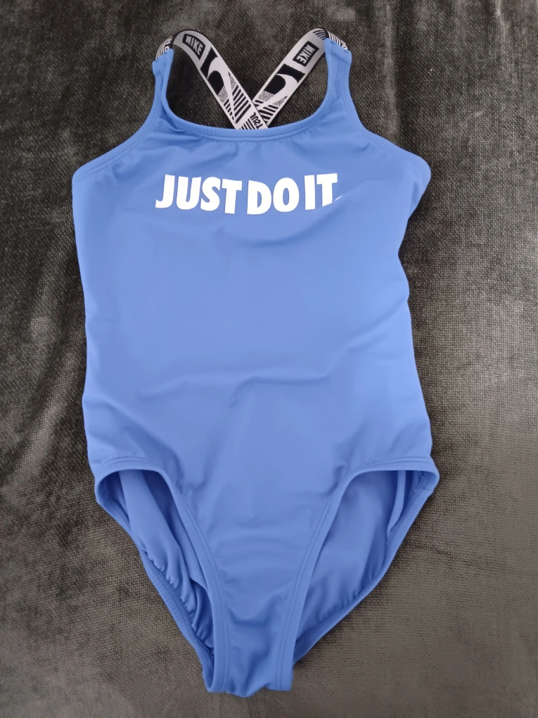 Selling a gently used Nike girls' swimsuit in size 8-10 years. It's a lovely blue colour with the iconic "JUST DO IT" slogan on the front and Nike branded straps. Great for swimming lessons or fun at the beach!
