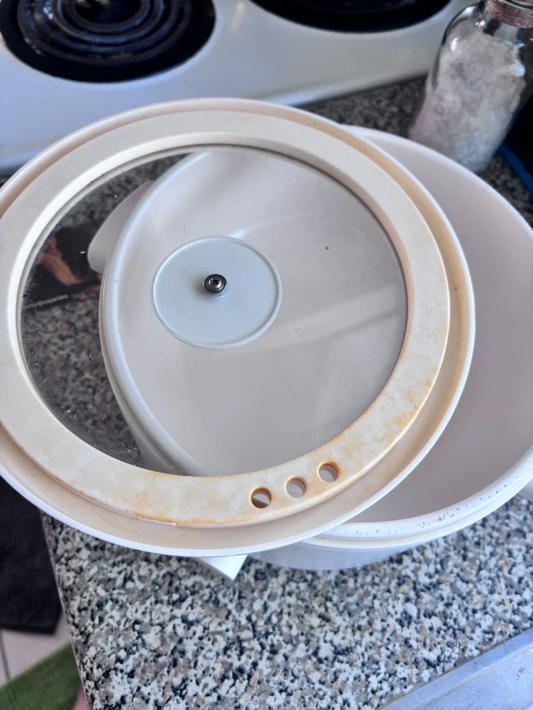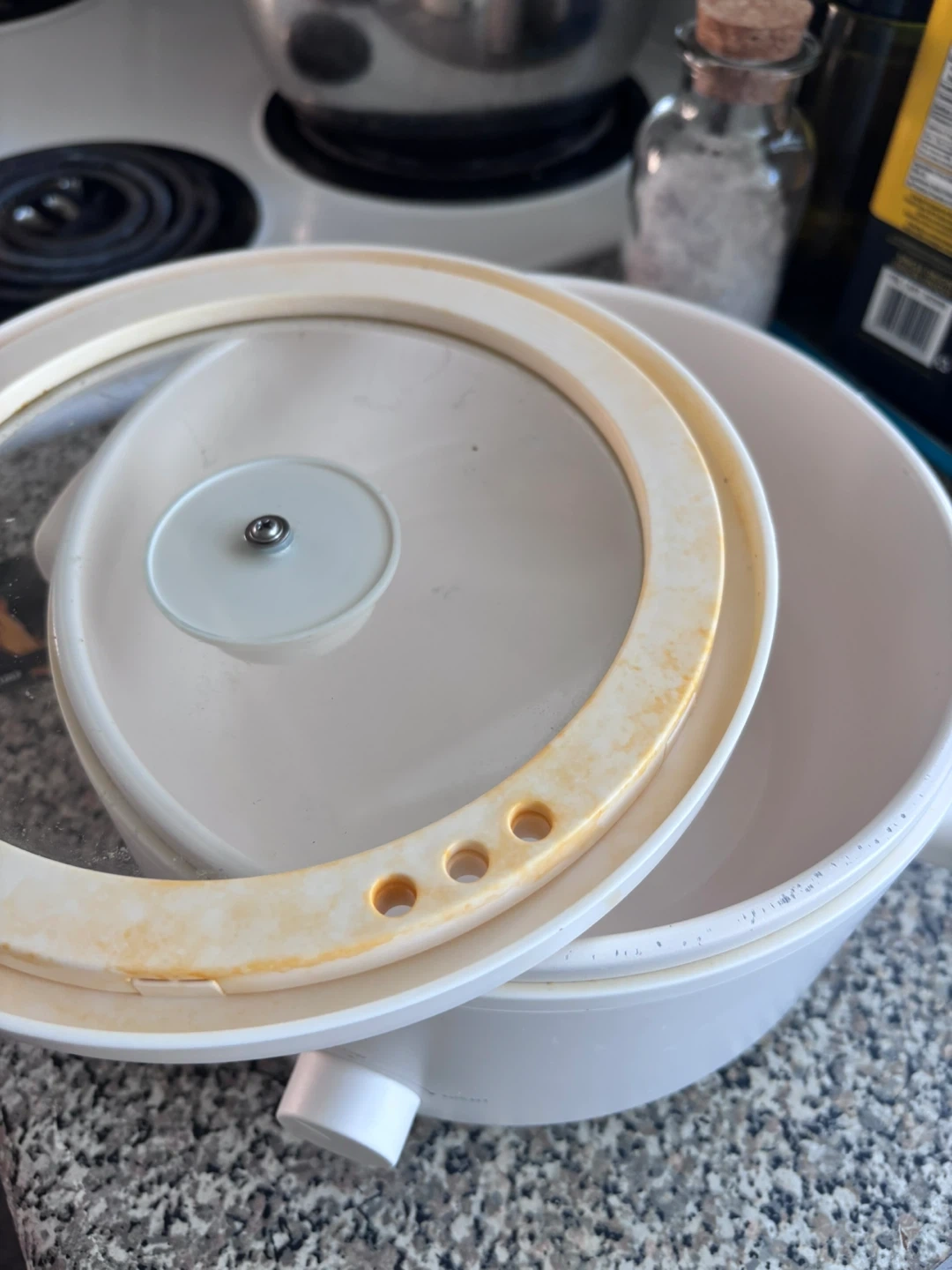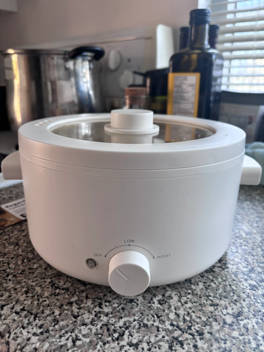 Selling a white slow cooker, good for indoor soup or apt food. It has settings for off, low, and high heat. The lid & cord are included! It just has a stain from oily spicy soup (cant get rid of)