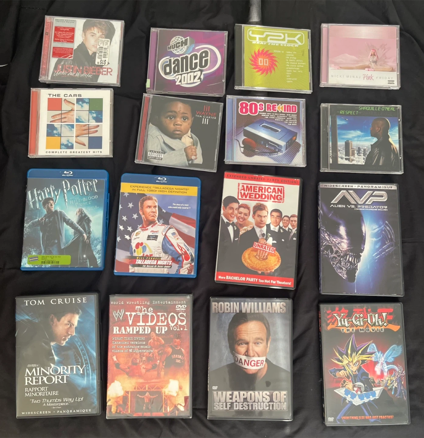Selling a mixed lot of CDs and DVDs! Includes titles like Justin Bieber's "Under the Mistletoe", "Much Dance 2002", Nicki Minaj's "Pink Friday", The Cars' "Complete Greatest Hits", Lil Wayne Tha Carter III, and more CDs. Also includes DVDs such as "Harry Potter and the Half-Blood Prince", "Talladega Nights", "American Wedding", "Alien vs Predator", "Minority Report", "The Videos Ramped Up Vol.1", "Weapons of Self Destruction", and "Yu-Gi-Oh! The Movie"