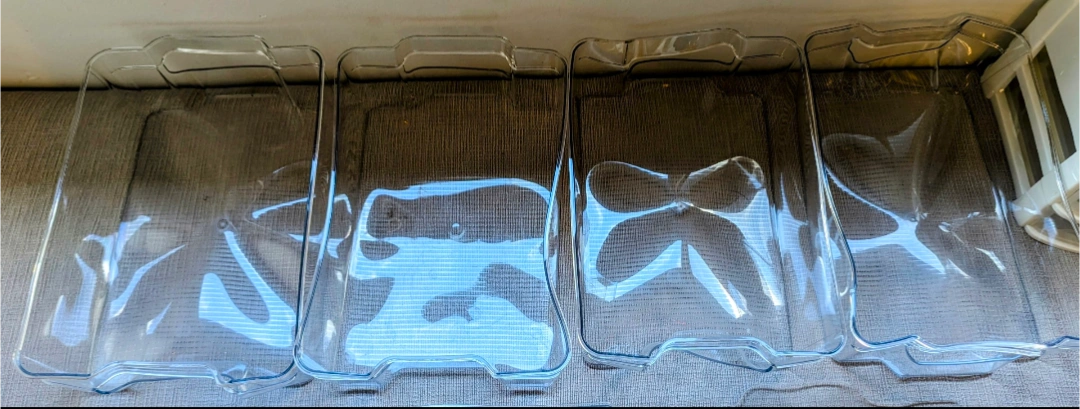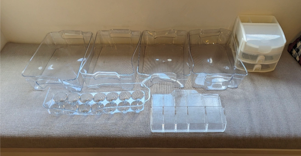 Clear Fridge Organizer Bins and Desk Storage Declutter your fridge with this set of clear organizer bins! Includes four large bins, an egg holder, and a small organizer with drawers and a desk organizer. Unfortunately, some of these were slightly deformed in the dishwasher (mainly the fridge bins and egg storage bin), but they are still in great function condition so hoping someone can get good use out of them. These are similar to bins used by The Home Edit.