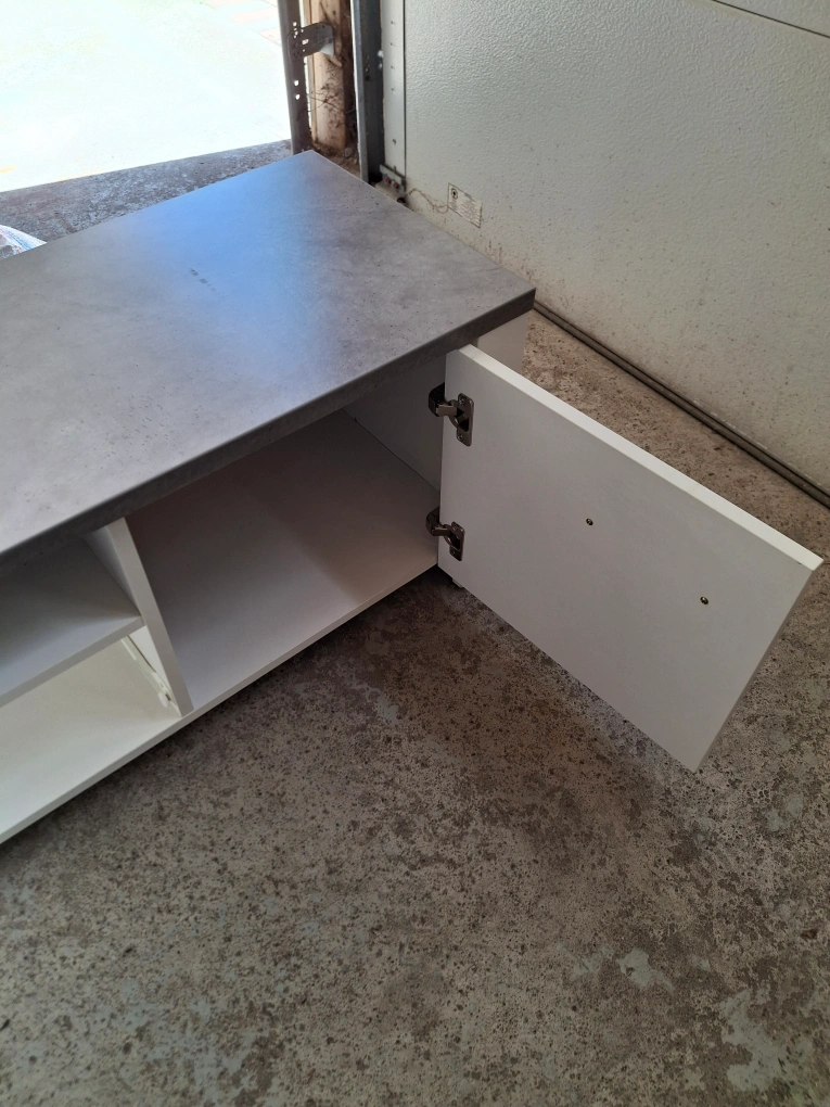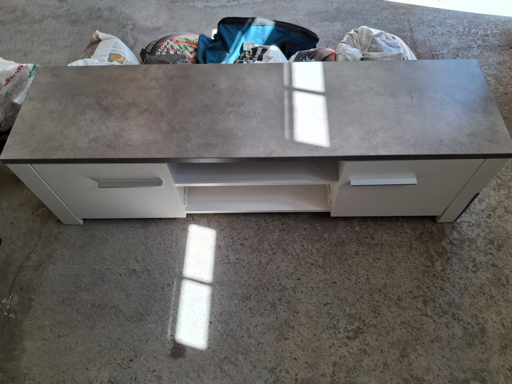 used Selling a TV stand or media console. It features a grey top and a white base with doors and and a draw slightly damaged see picture