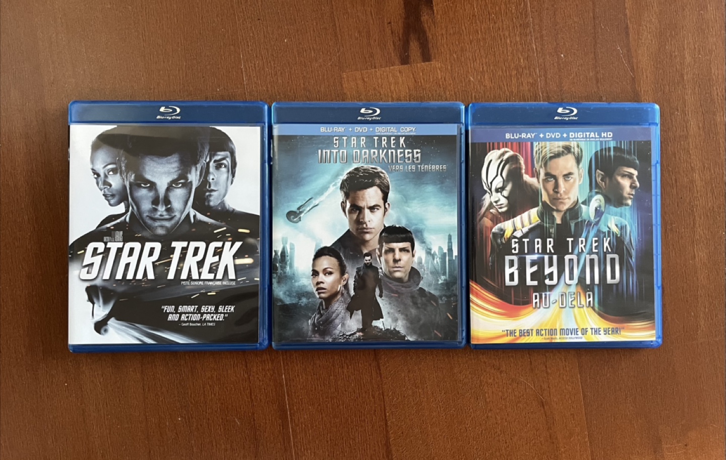 Selling a collection of Star Trek movies on Blu-Ray! Includes the films Star Trek, Star Trek Into Darkness, and Star Trek Beyond. All in great condition and ready for a new home for movie night!