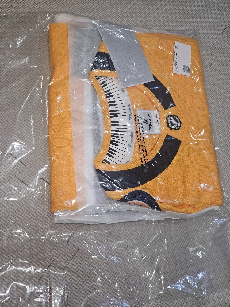 Selling a new Nashville Predators youth jersey! It's a size S/M and is an official licensed NHL jersey by Fanatics. The jersey is yellow with black and white accents, featuring the Predators logo. Great for any young hockey fan!