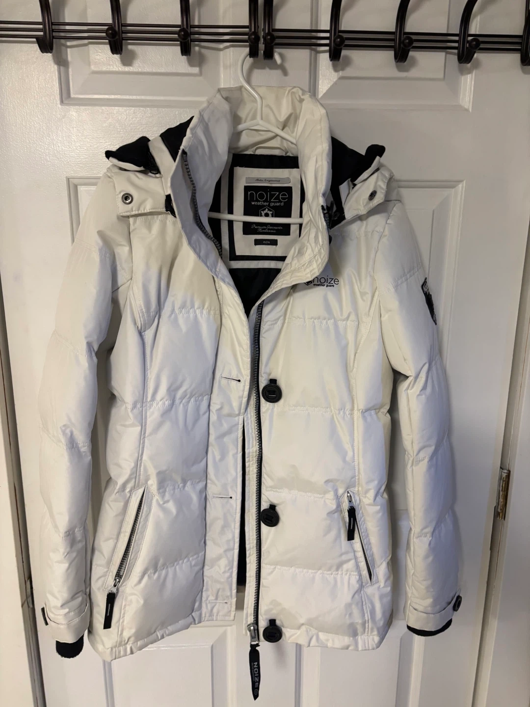 Selling a Noize Weather Guard puffer jacket in white! It's in great condition and perfect for the Canadian weather. The size is M/M. It has a black interior and lots of pockets and a Removable hood.