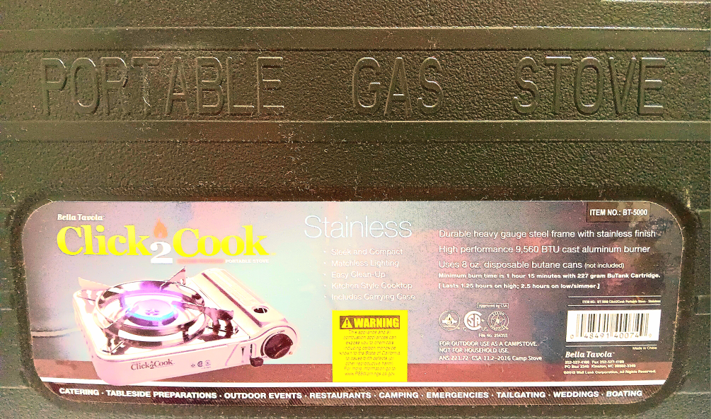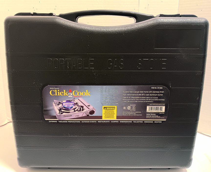 I am selling a new Click2Cook stainless steel portable gas stove, perfect for catering, outdoor events, camping, and more. It features a heavy-duty steel frame with a stainless finish and a high-performance BTU cast aluminum burner. The stove uses inexpensive butane cartridges and comes with a convenient carrying case.