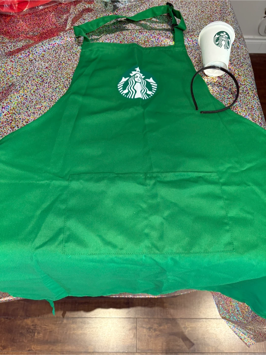 10Selling a Starbucks green apron! Perfect for any barista enthusiast or collector. The apron is in great condition and features the iconic Starbucks logo. It's perfect for Halloween. Special handmade headband included