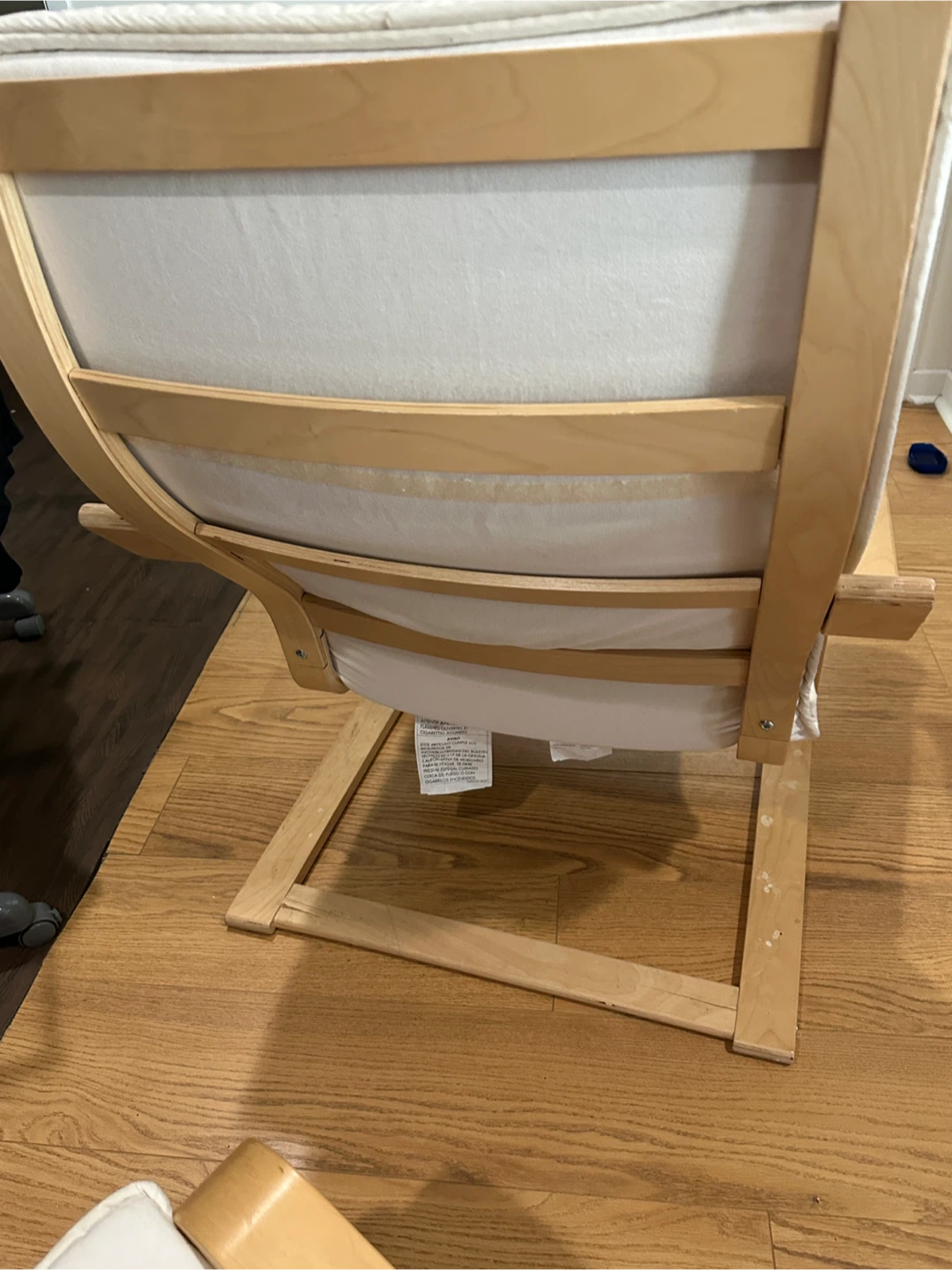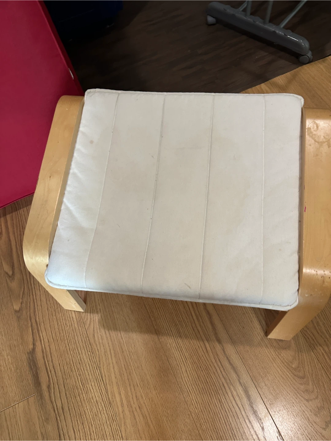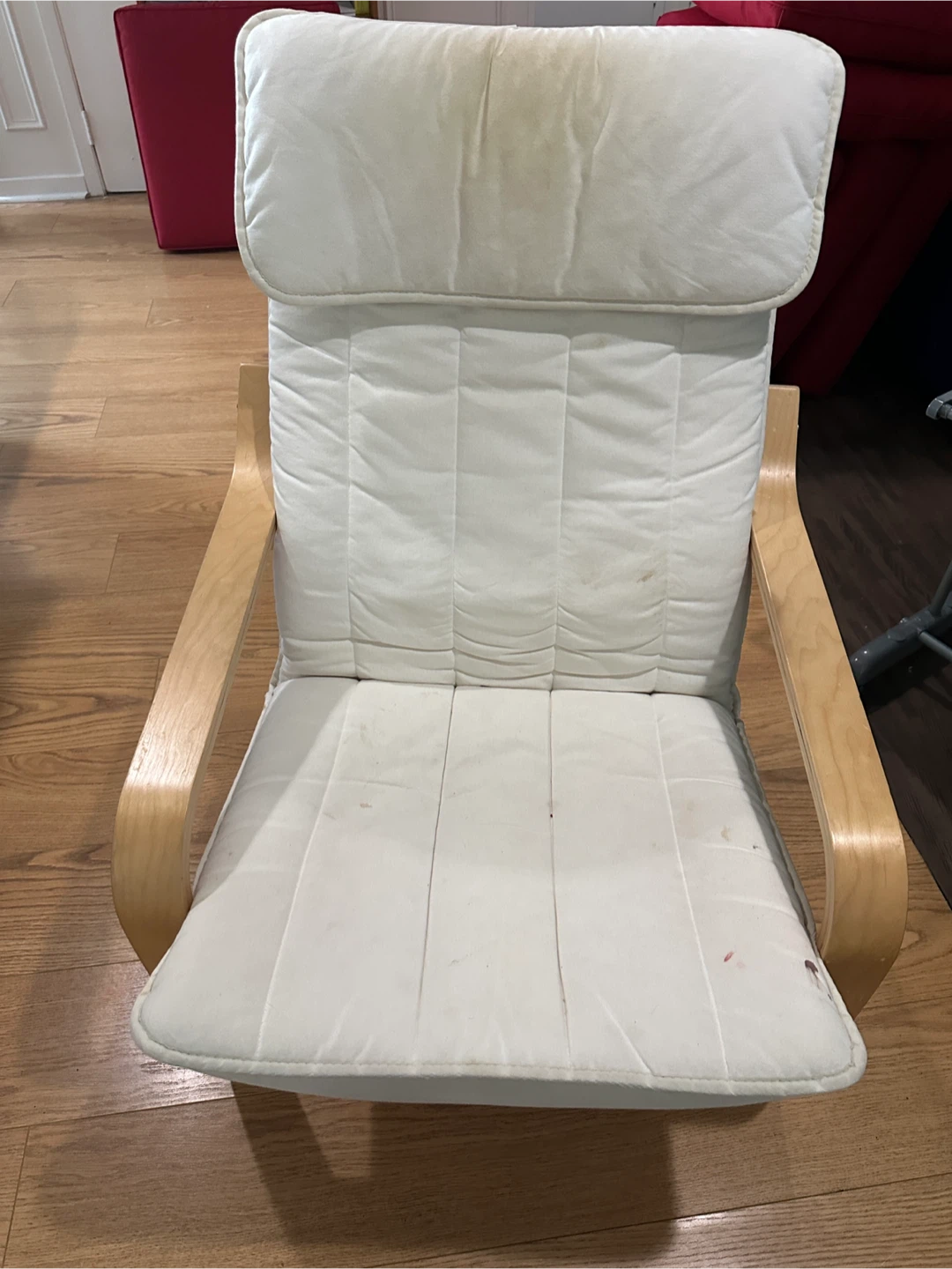 Selling an IKEA Poang chair with a matching footstool. It's in used condition, with some wear and tear, as you can see in the pictures. Great for relaxing!
