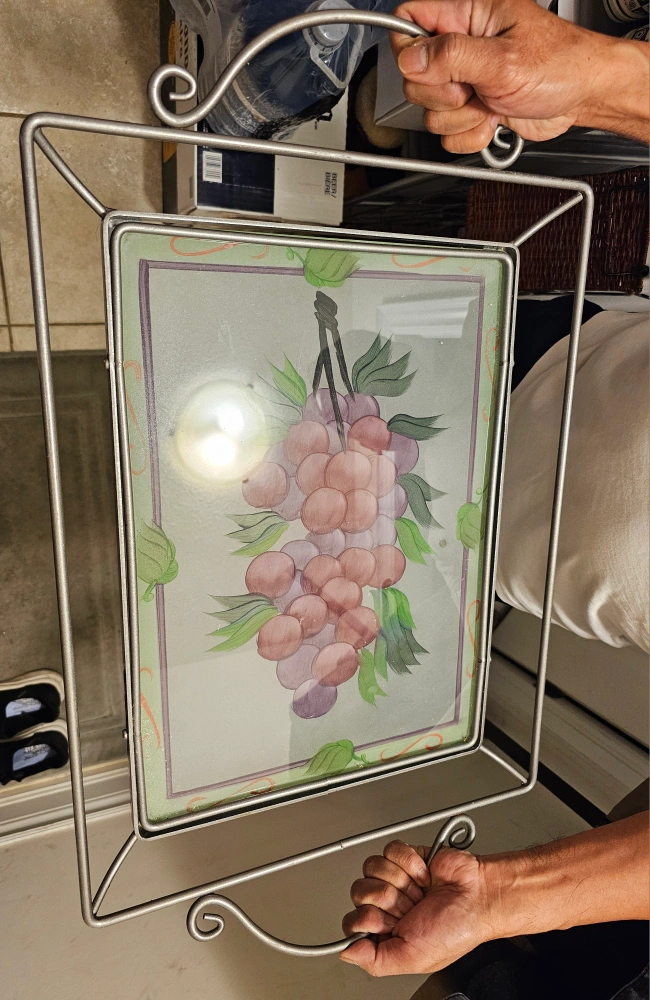 Selling a charming vintage glass tray with a metal frame! It features a lovely grape design. Perfect for adding a touch of vintage elegance to your home decor