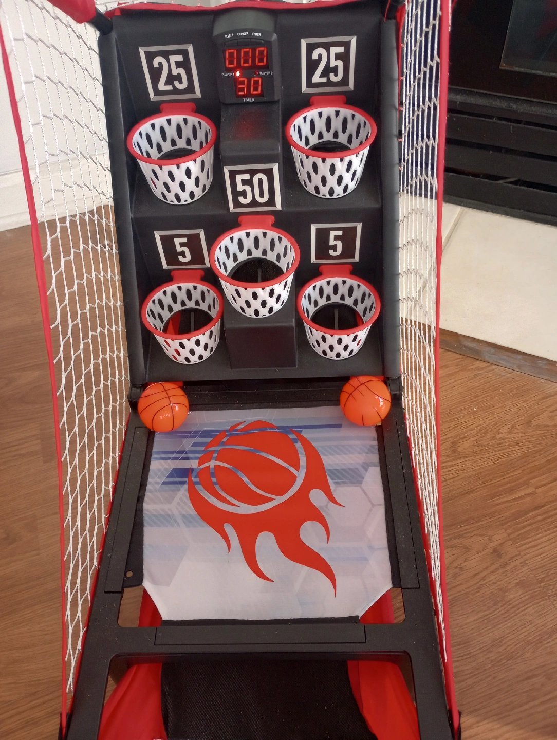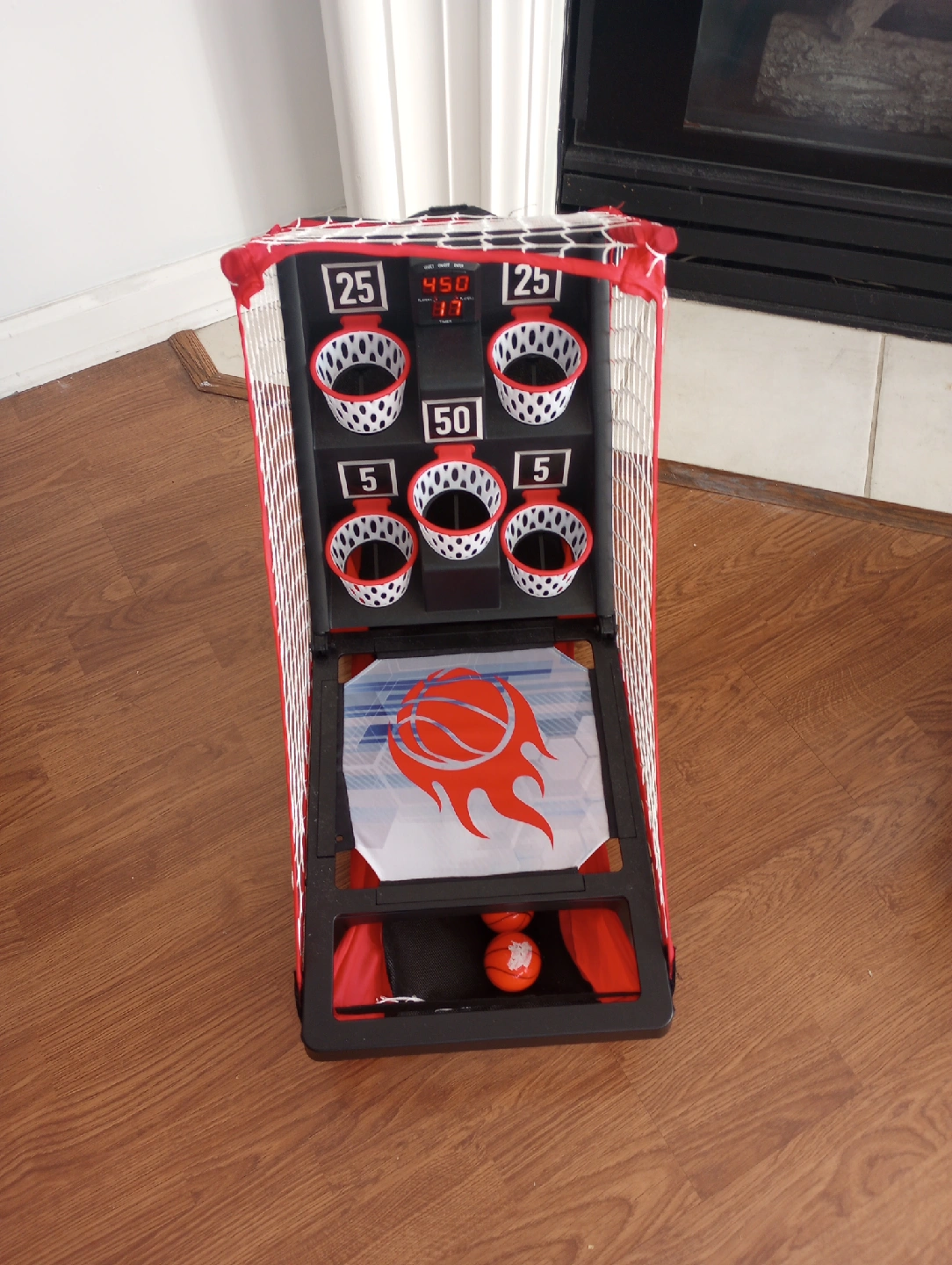 Fun basketball arcade game! It's in great condition and ready for a new home. Perfect for kids and adults alike to enjoy some friendly competition. It tells the score when you basket the ball.