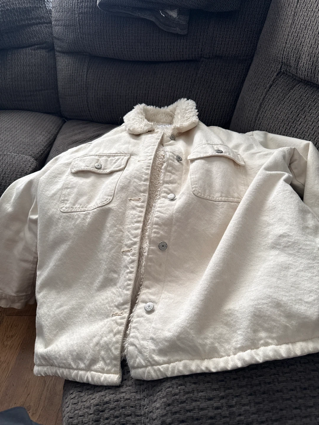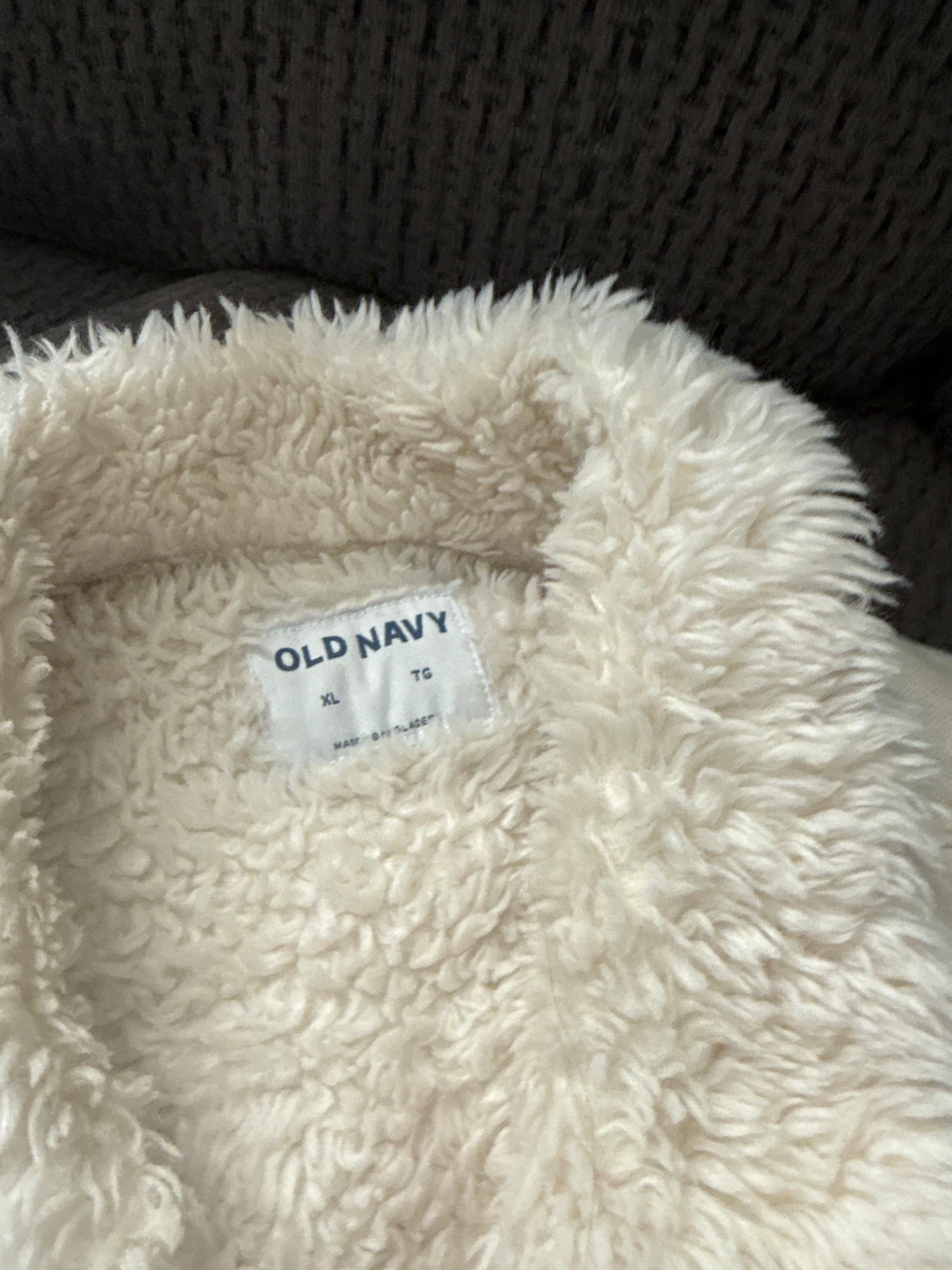 Cozy up in this Old Navy sherpa-lined jacket! It's an XL and perfect for those chilly Canadian days. The sherpa lining adds extra warmth and comfort, making it a great addition to your wardrobe