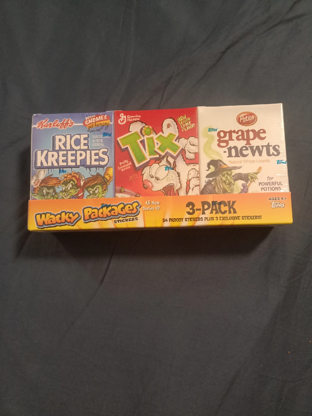 60Selling a Topps Wacky Packages All-New Series 10 Mini-Ca 3-Pack. It includes 54 parody stickers plus 3 exclusive stickers! Recommended for ages 6+