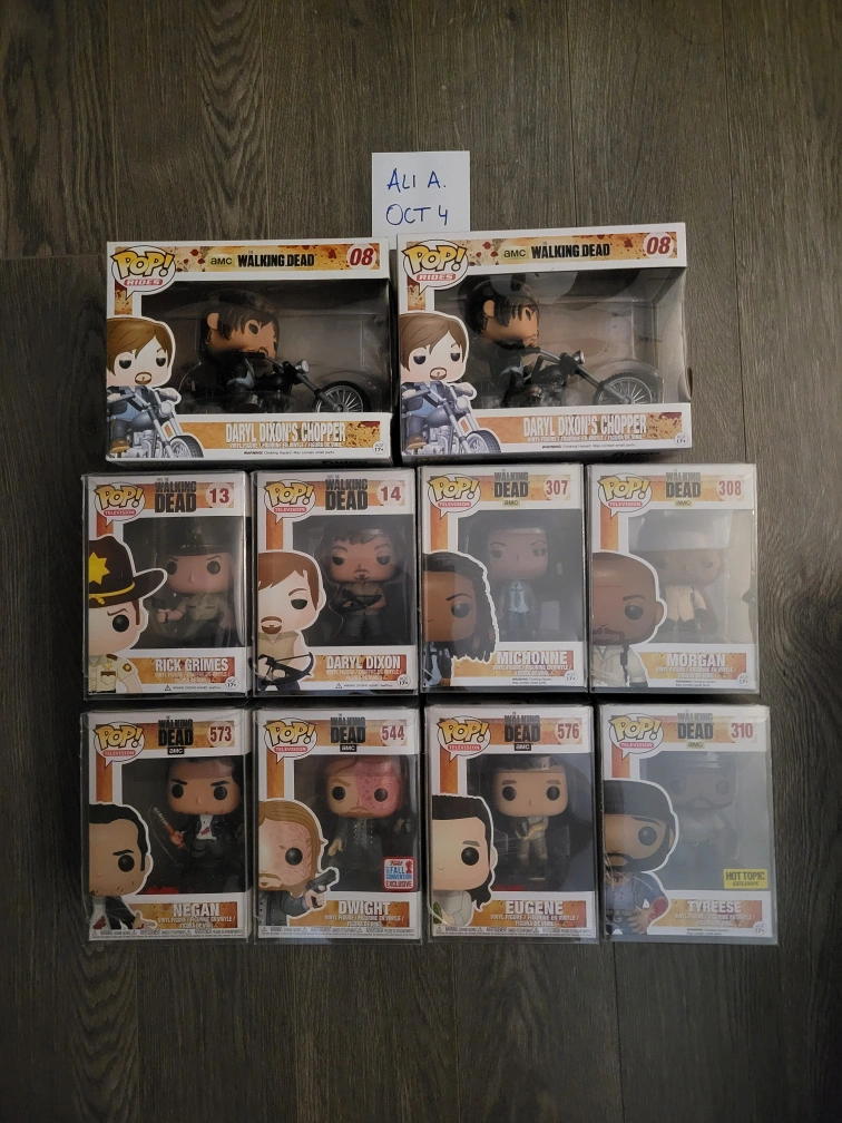 Selling a collection of Funko Pop! figures from The Walking Dead series. Includes Daryl Dixon's Chopper, Rick Grimes, Negan, Dwight (Fall Exclusive), Eugene, Tyrese, Michonne, and Morgan. Great for any fan or collector!