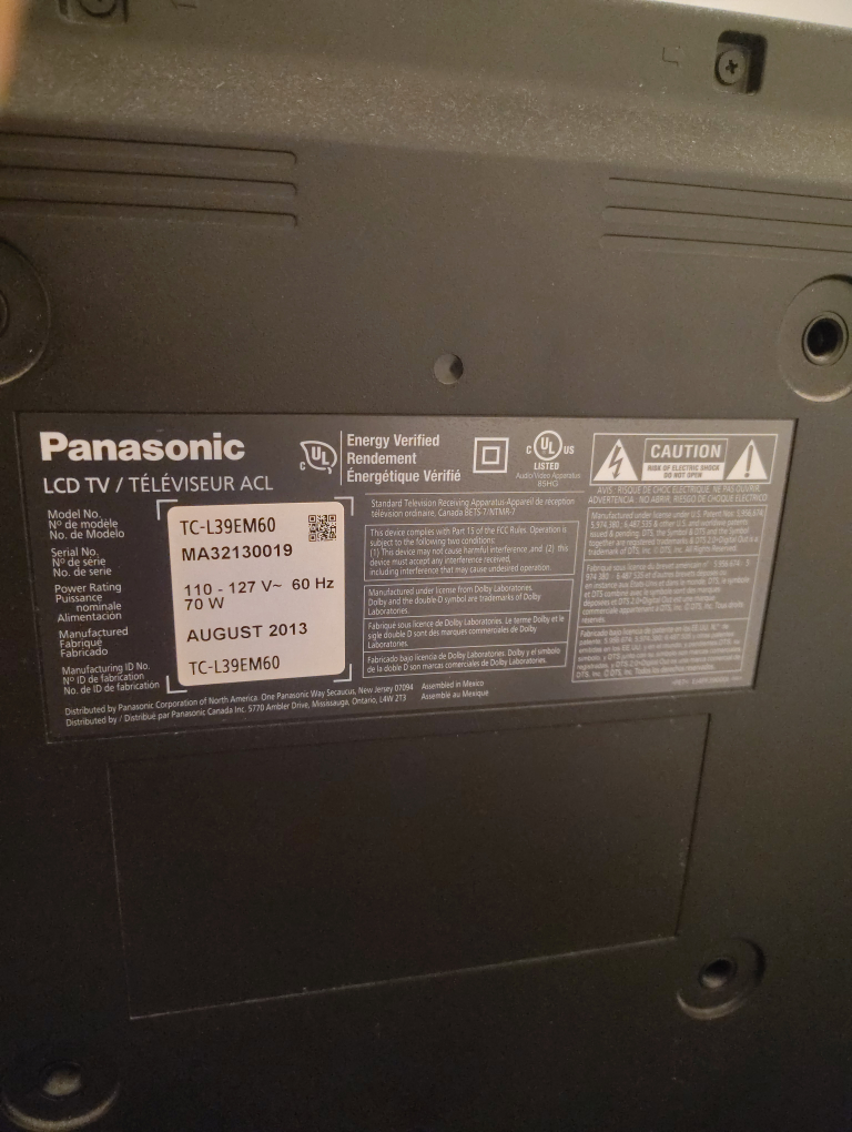 Selling a Panasonic 39-inch LCD TV, model number TC-L39EM60. It was manufactured in August 2013. It runs on 110-127V ~ 60 Hz, 70W. Ready for a new home! Comes with the power cord and remote control. Comes with HDMI cable too.