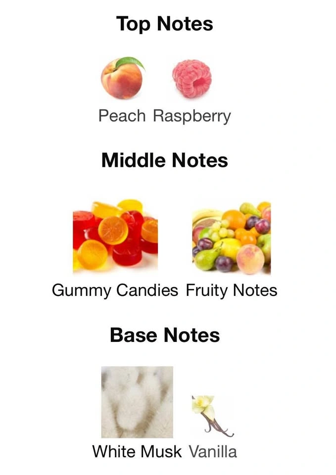 A sweet, fruity-gourmand fragrance with a soft musky base — playful, delicious, and comforting.