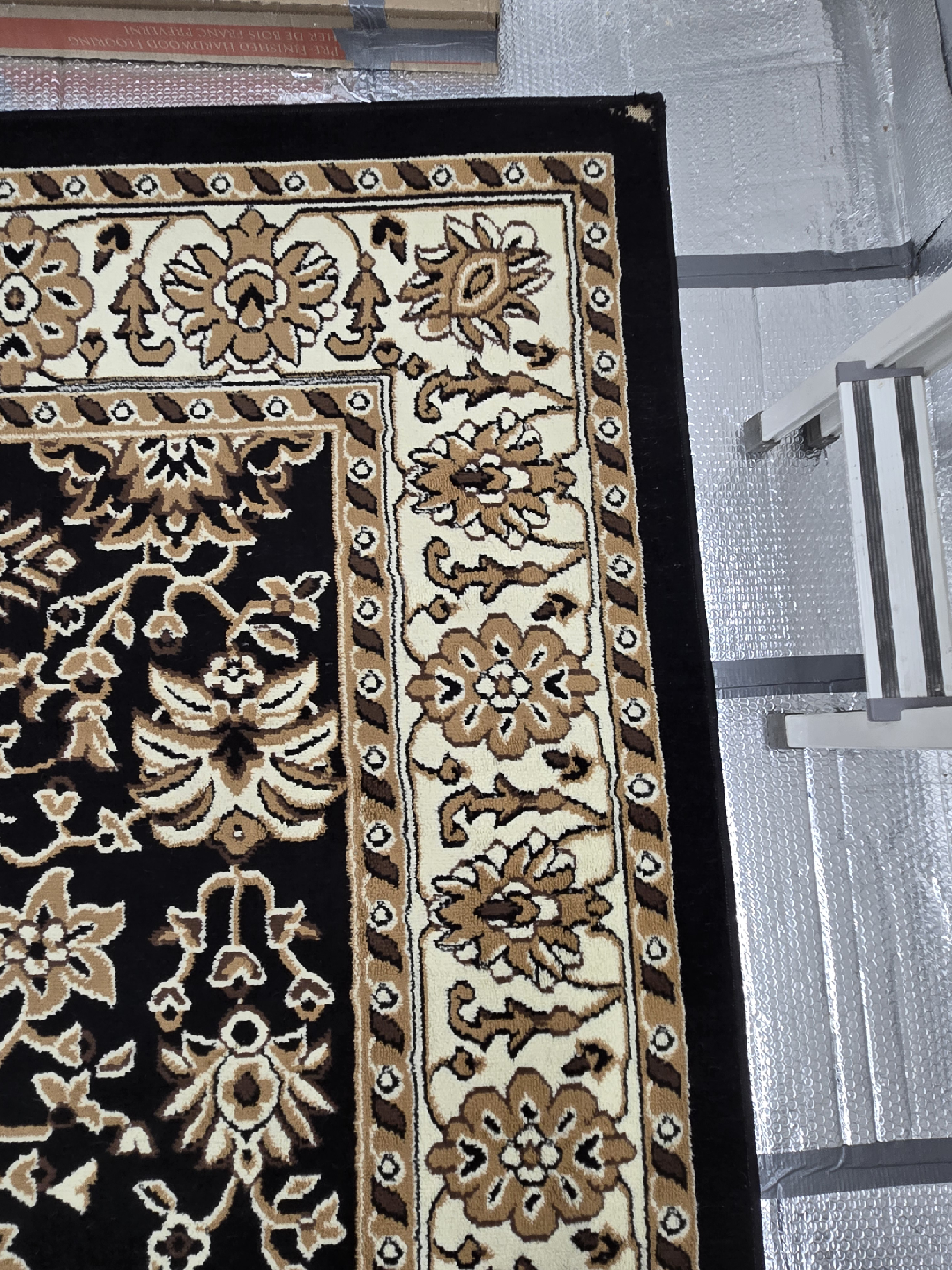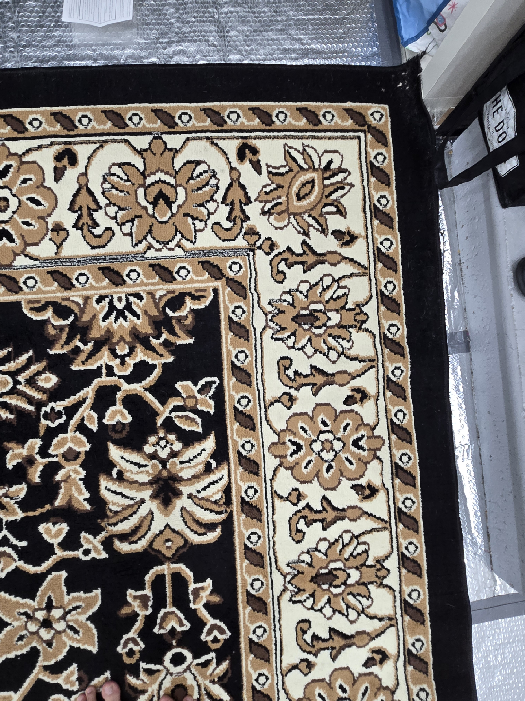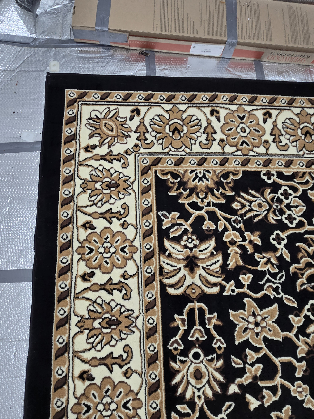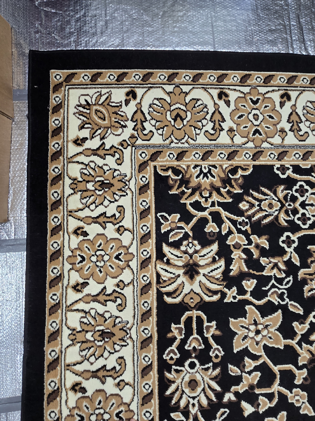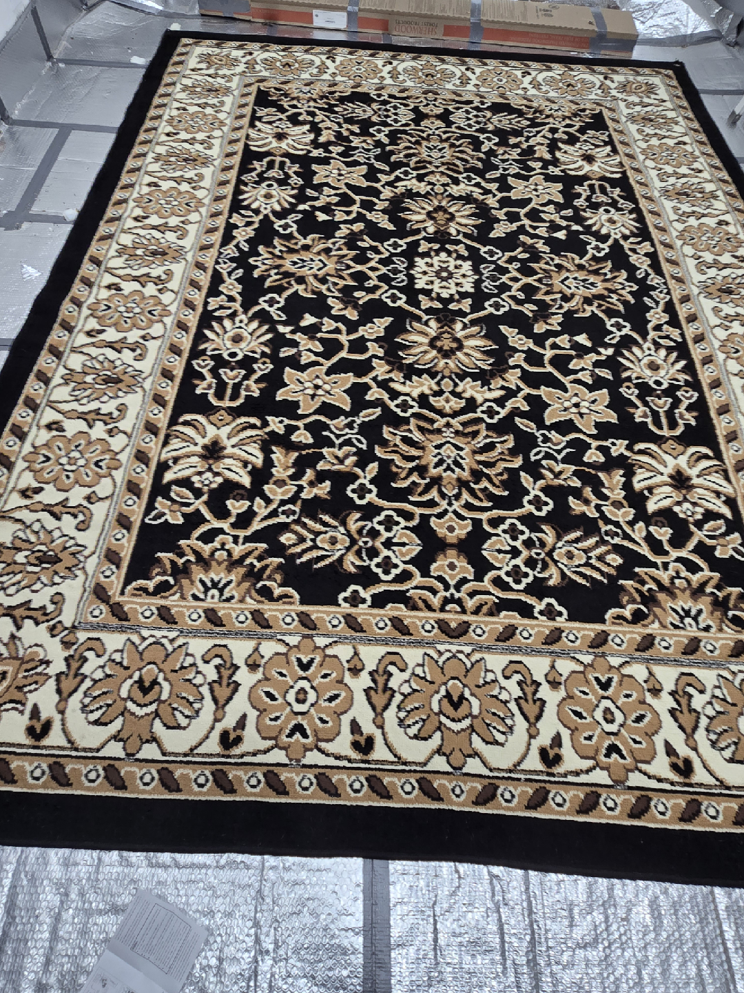 Selling a lovely area rug with a beautiful floral pattern! It's primarily black with beige and brown accents in the floral design and border. It would look great in a living room or bedroom.