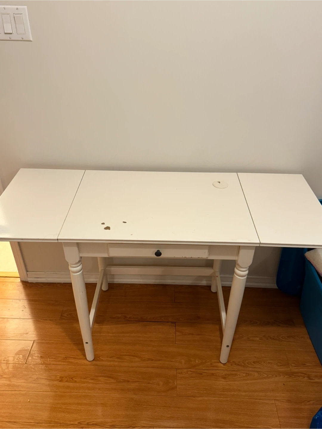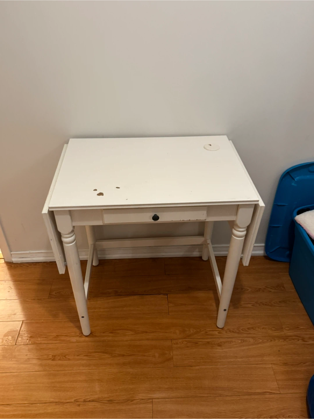 Selling a white drop leaf desk. It's perfect for small spaces and can be folded down when not in use. Great for a home office or study area
