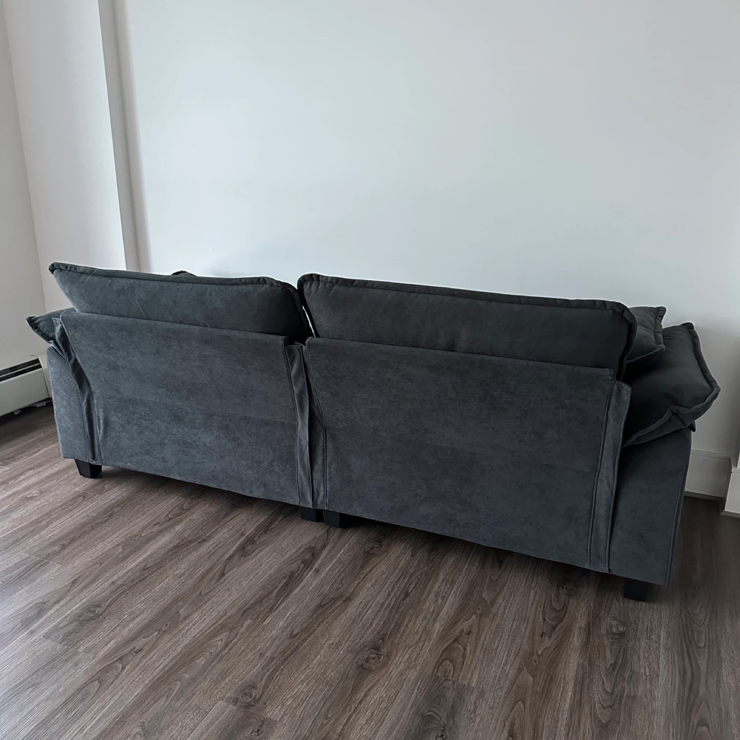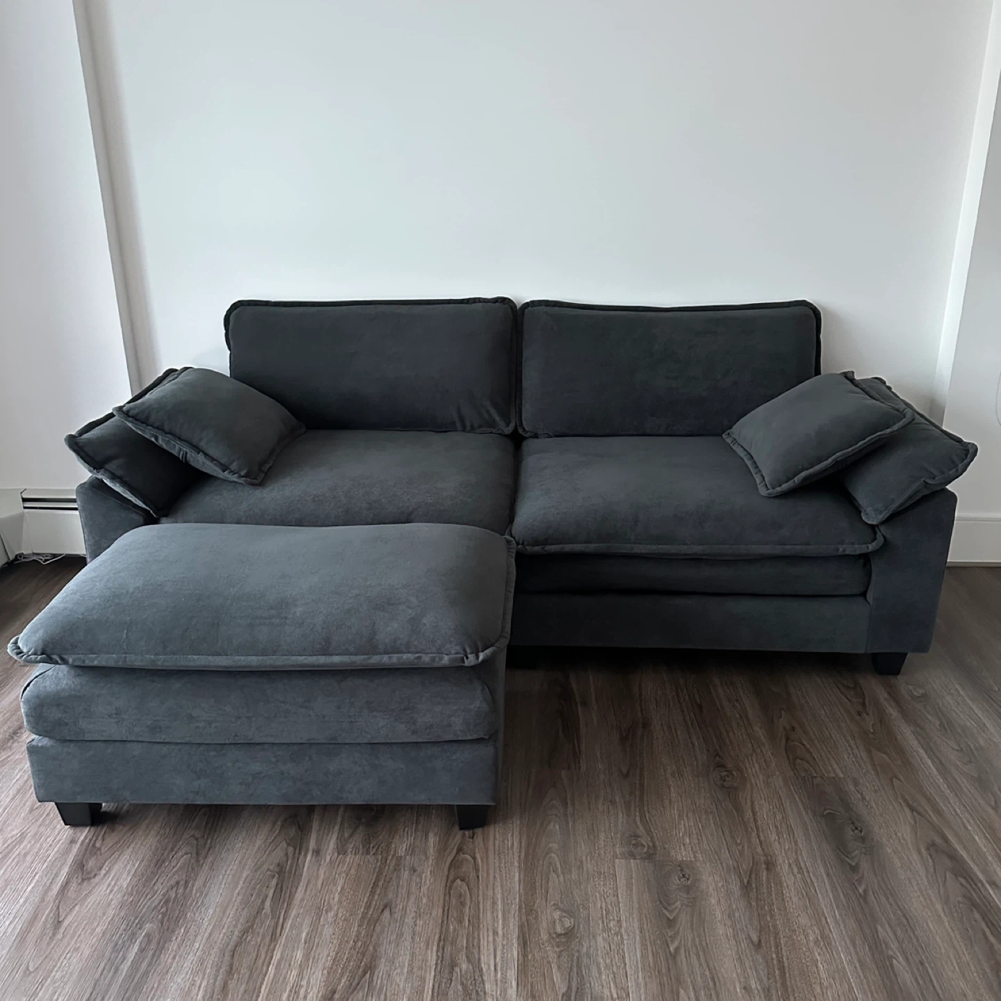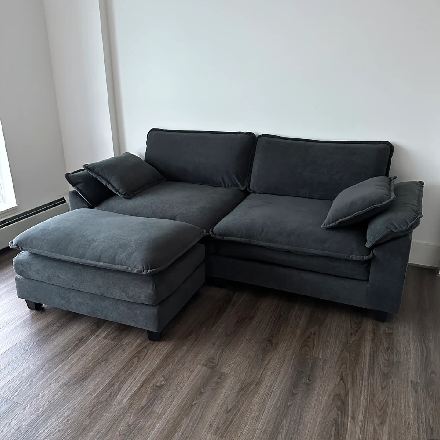 85.8” Dark Gray Velvet Sectional Sofa with Ottoman, Pillows and Cushions