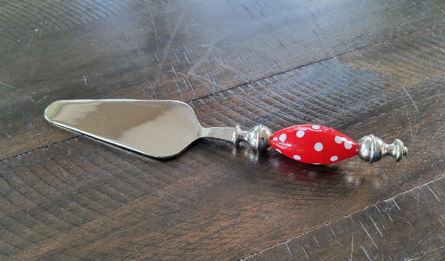 Selling a charming cake server! It has a silver-tone blade and a delightful red handle with white polka dots. Perfect for serving up slices of cake or pie at your next gathering