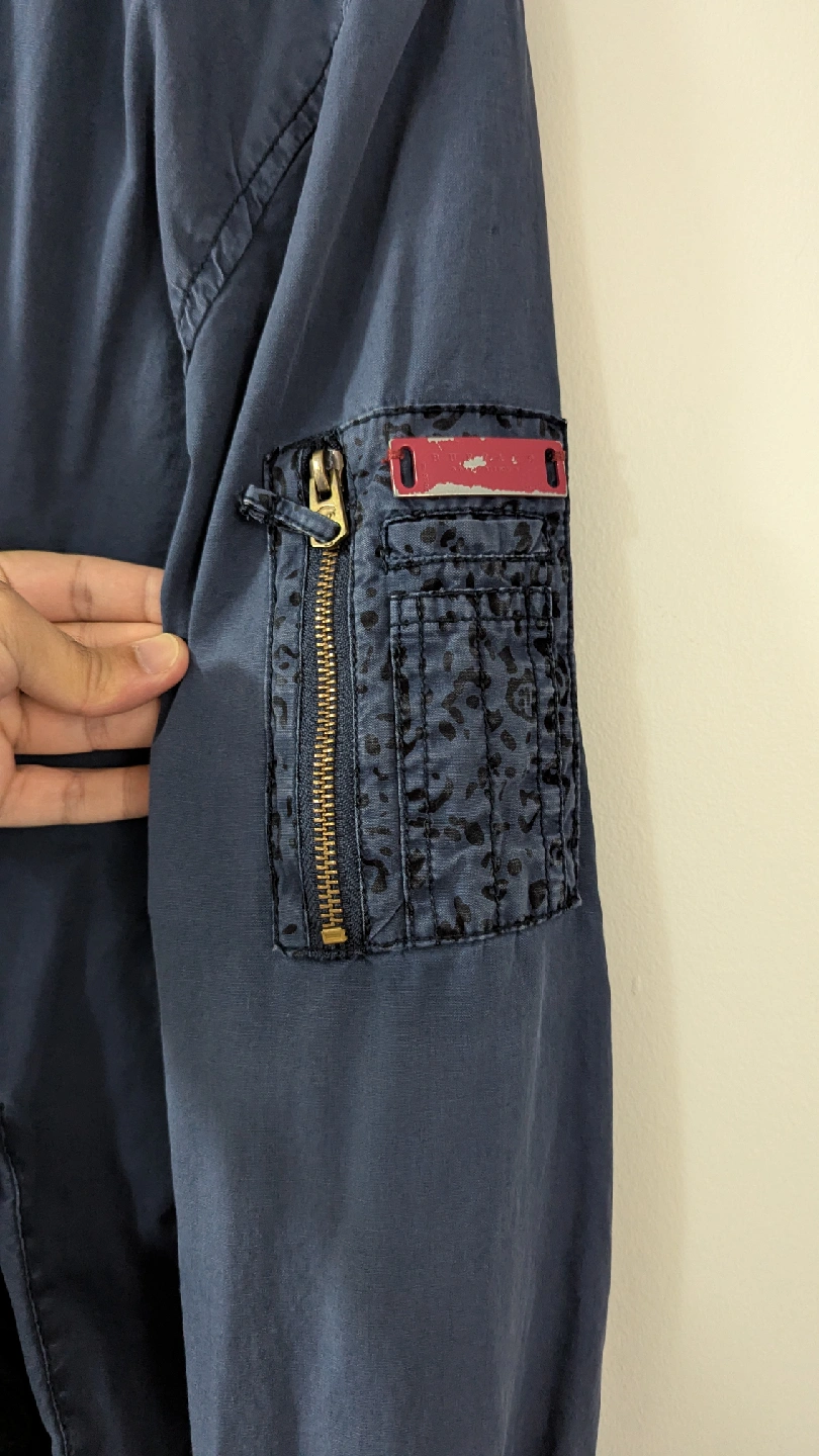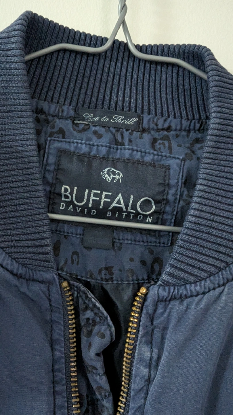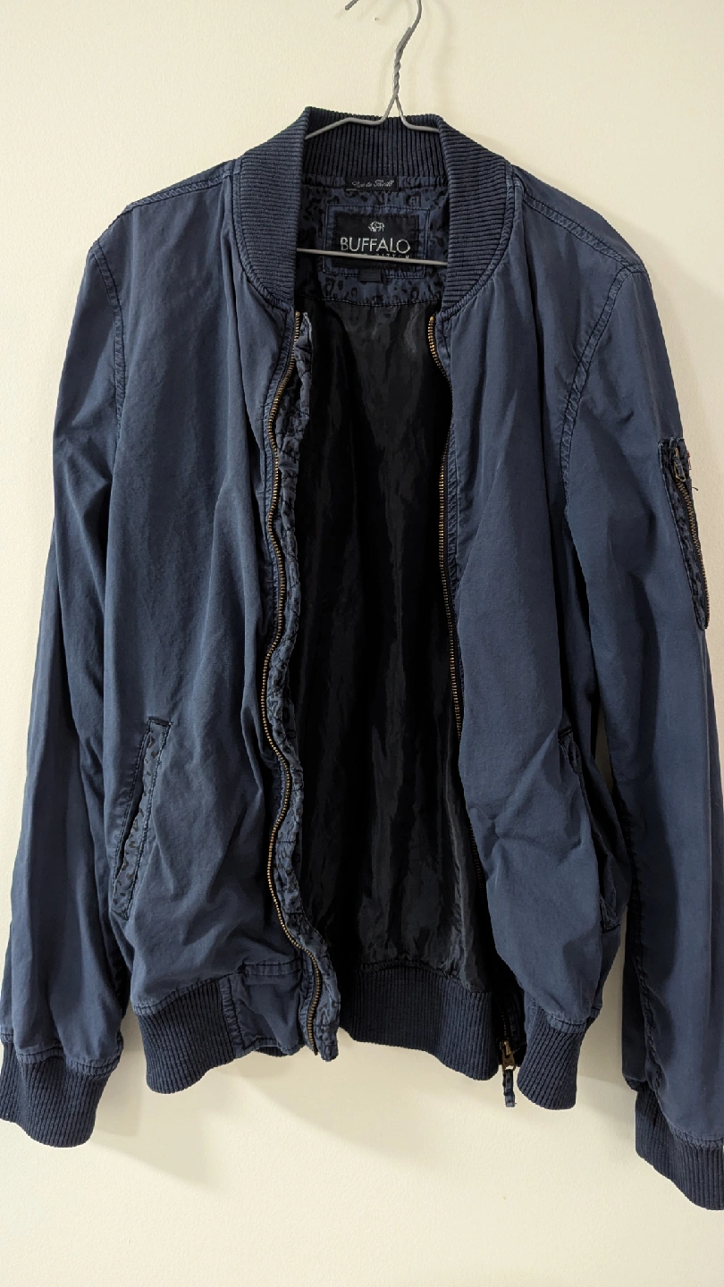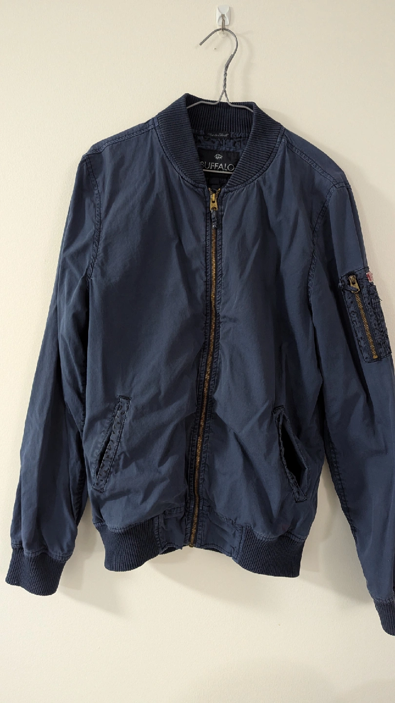 A stylish Buffalo David Bitton bomber jacket in a nice navy blue colour. It's a size small and made with a cotton/polyester blend. Perfect for layering!