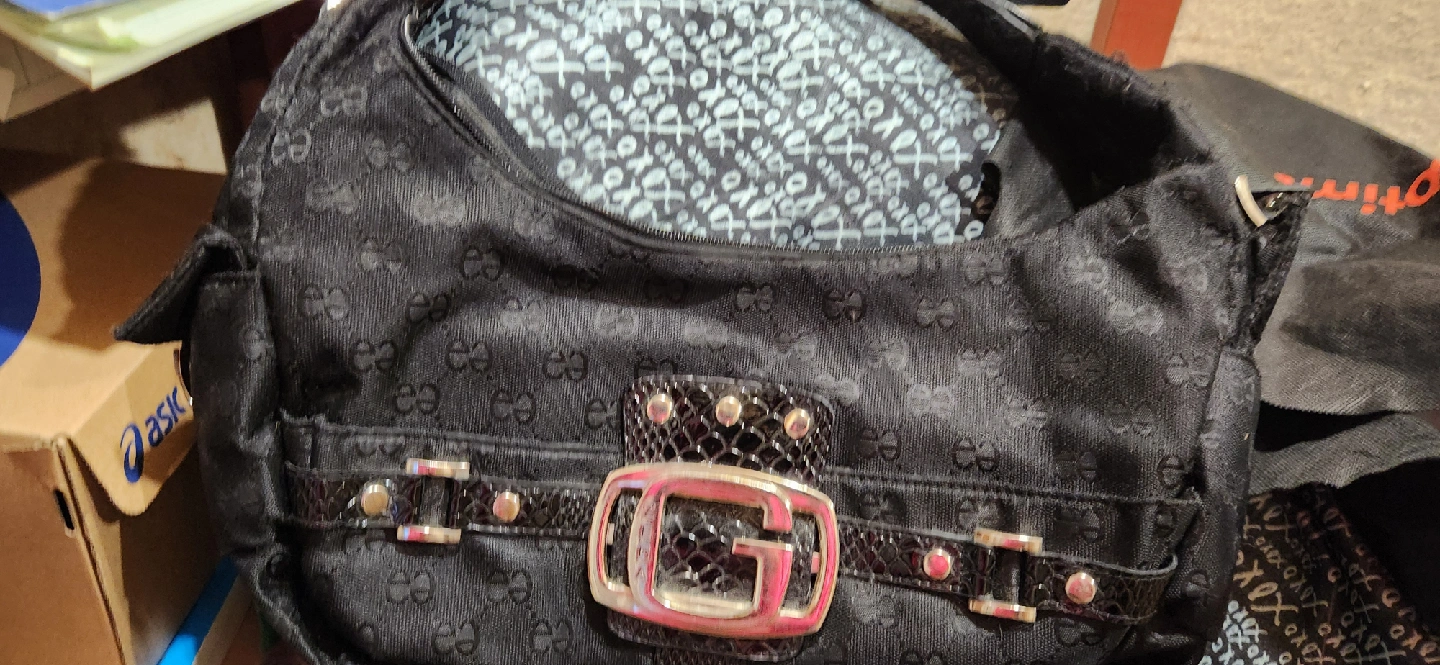 Here's a stylish Guess shoulder bag in black! It has a unique pattern and a bold 'G' logo buckle. Perfect for adding a touch of flair to any outfit