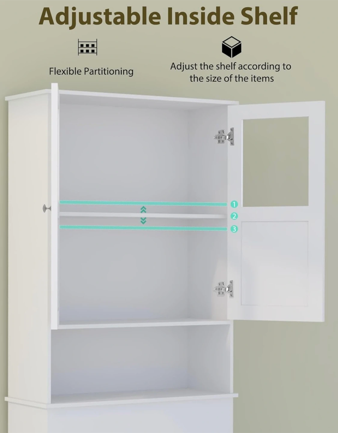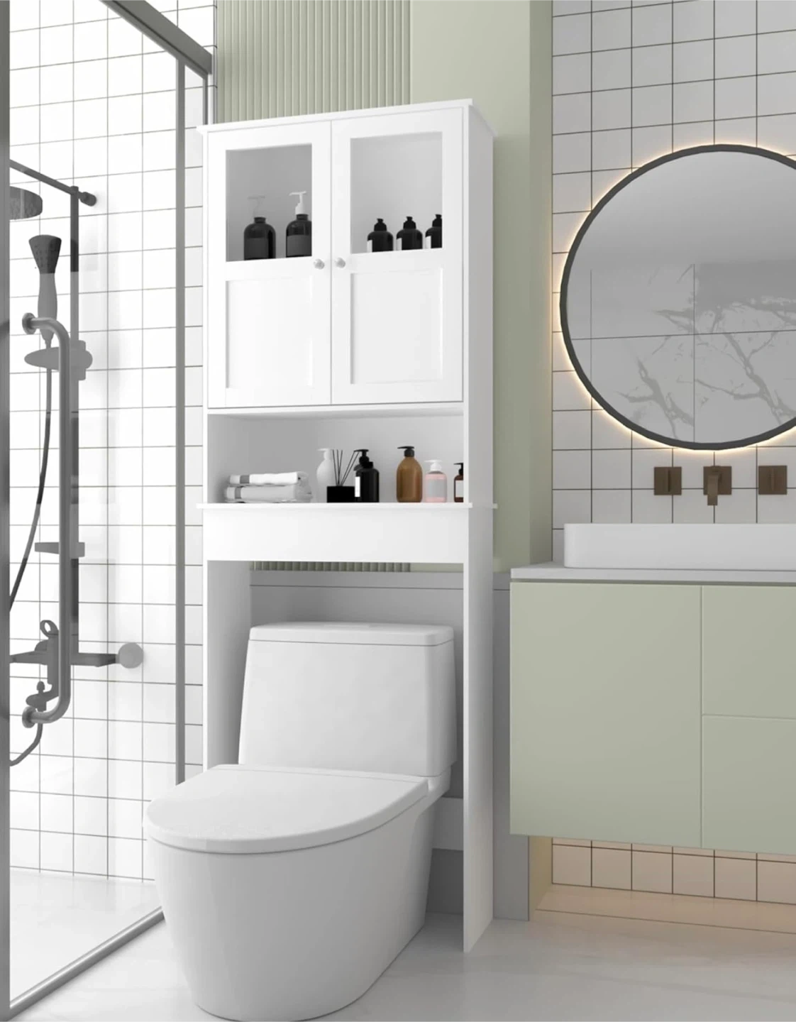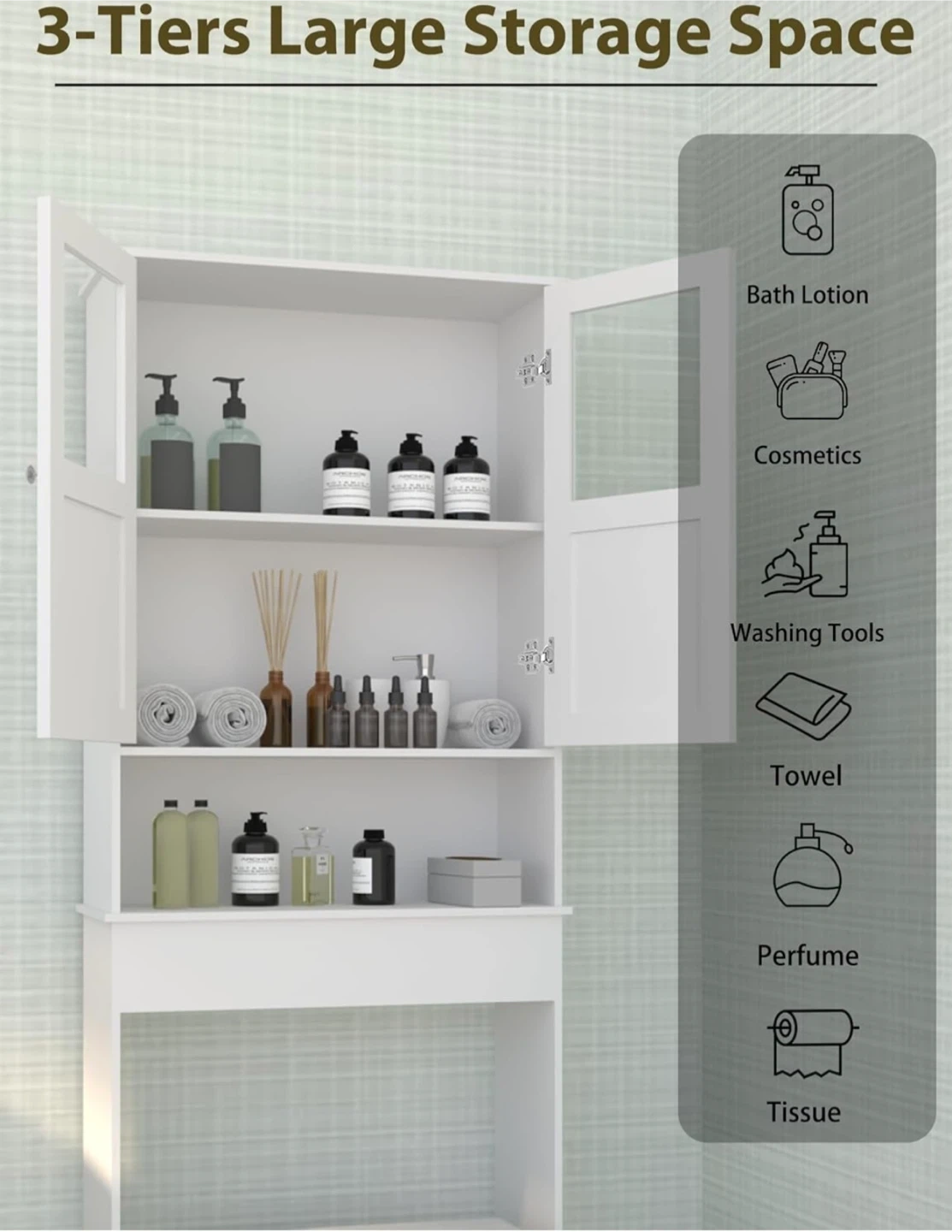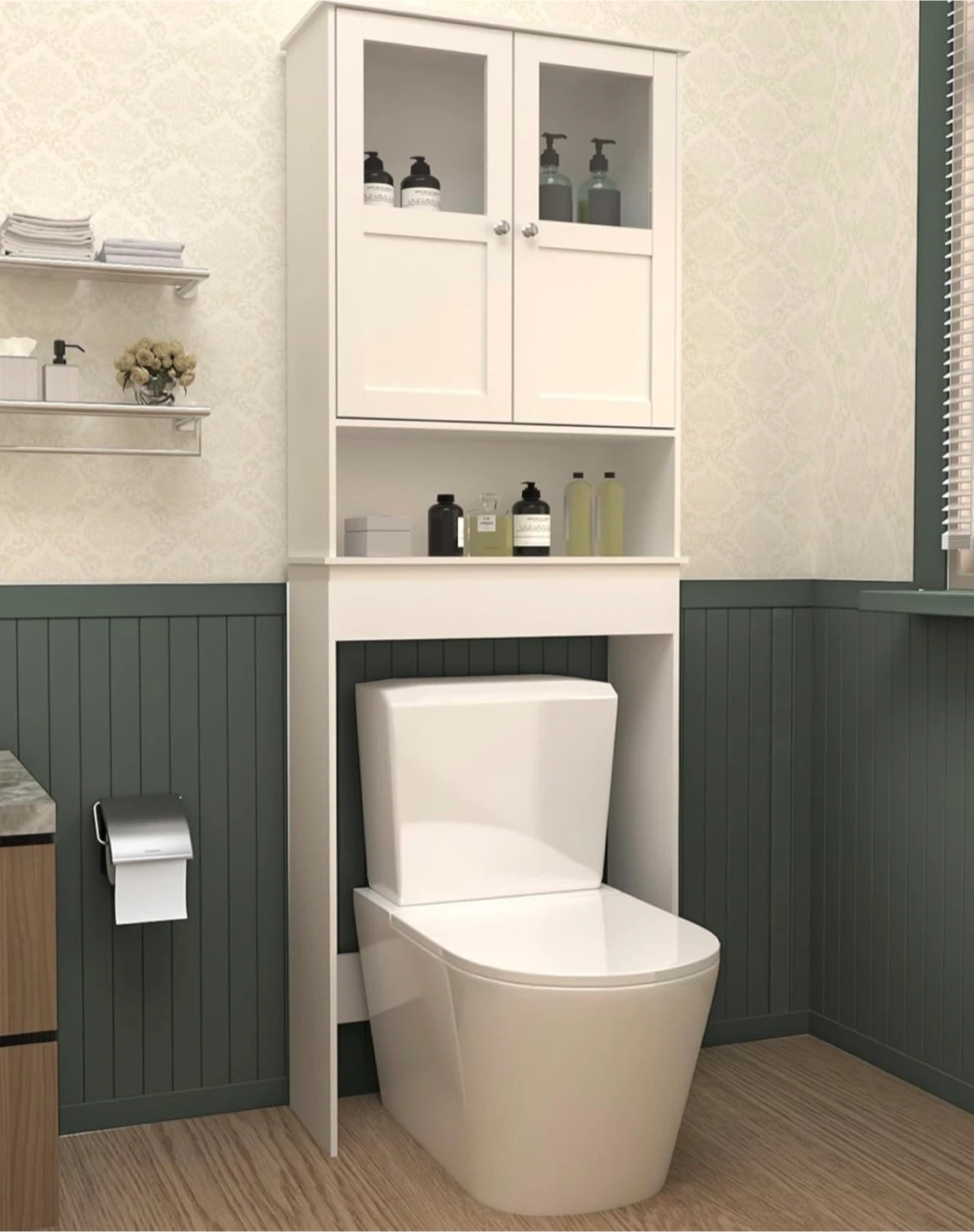 12This white over-the-toilet storage cabinet is perfect for adding extra storage to your bathroom! It features sleek metal knobs, stainless steel hinges, and an anti-tipping device for safety. The reinforced board and waterproof surface ensure durability, and the adjustable inside shelf lets you customize the space to fit your needs. It has 3 tiers of large storage space for bath lotion, cosmetics, washing tools, towels, perfume, and tissue. Measurements are included in the photos!