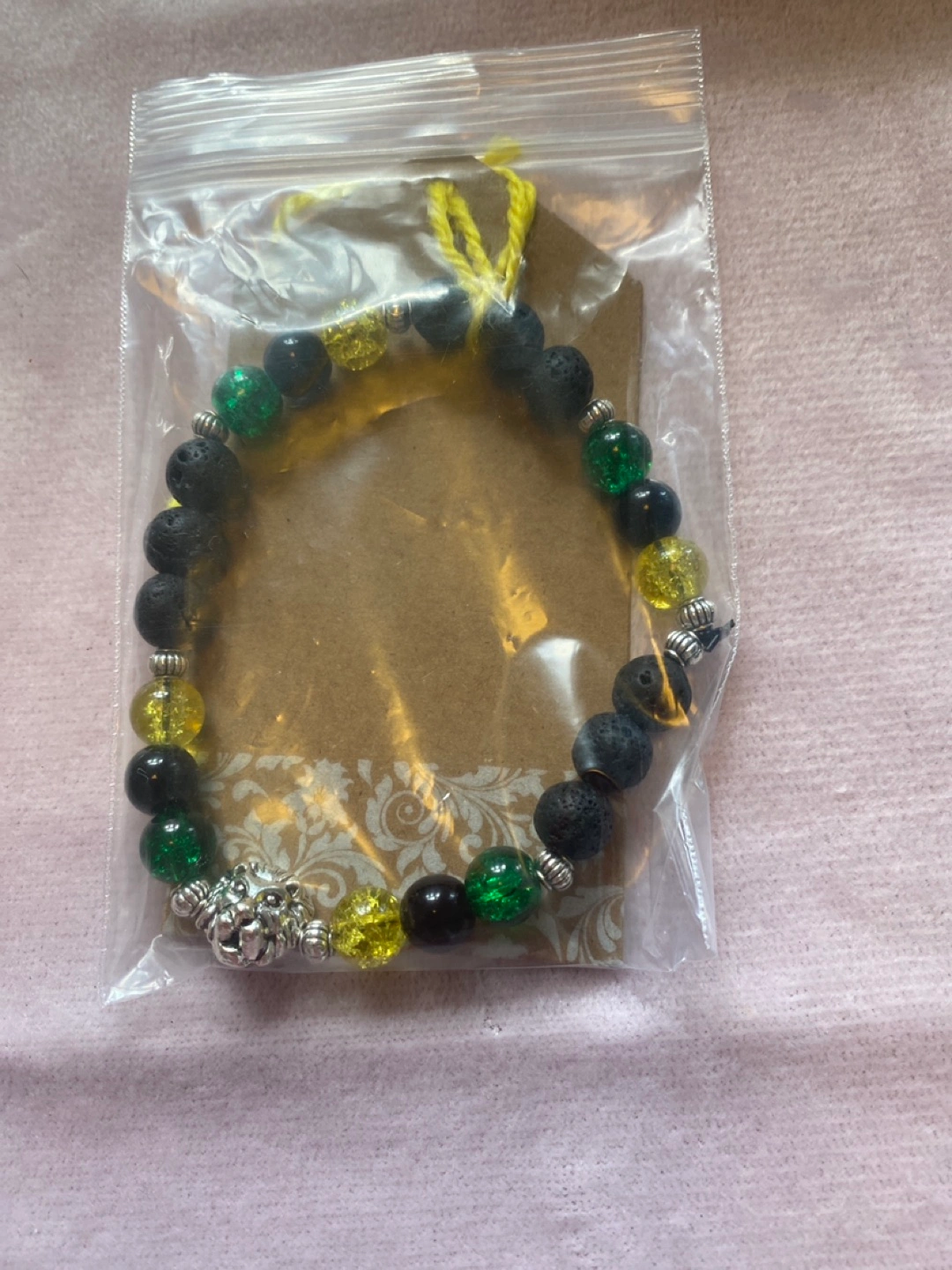Handcrafted Jamaica bracelet with silver lion pendant made with crackle glass beads, onyx stone beads and lava beads defused in essential oils to allow protection and positive energy. Represent traditional colours year long or to celebrate Caribana 🎉