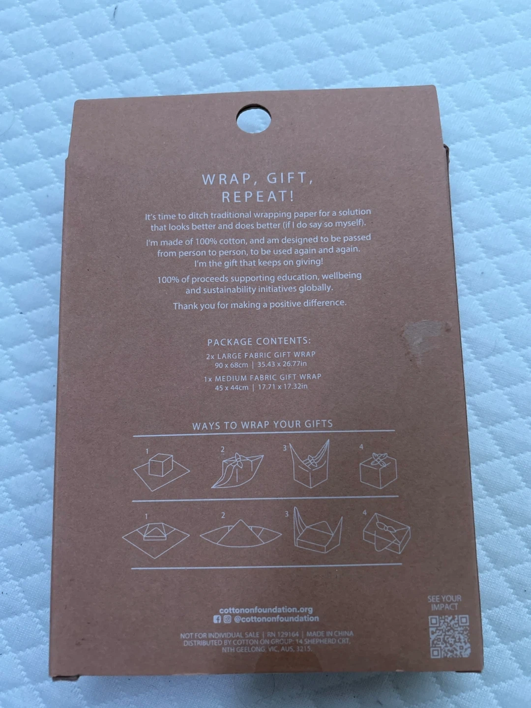 396This is a Cotton On Foundation Fabric Gift Wrap Set, containing a pack of 3 reusable fabric wraps! The package includes two large fabric gift wraps (90 x 68cm) and one medium fabric gift wrap (45 x 44cm). These are made of 100% cotton and designed to be reused again and again.