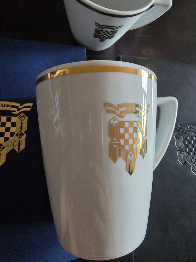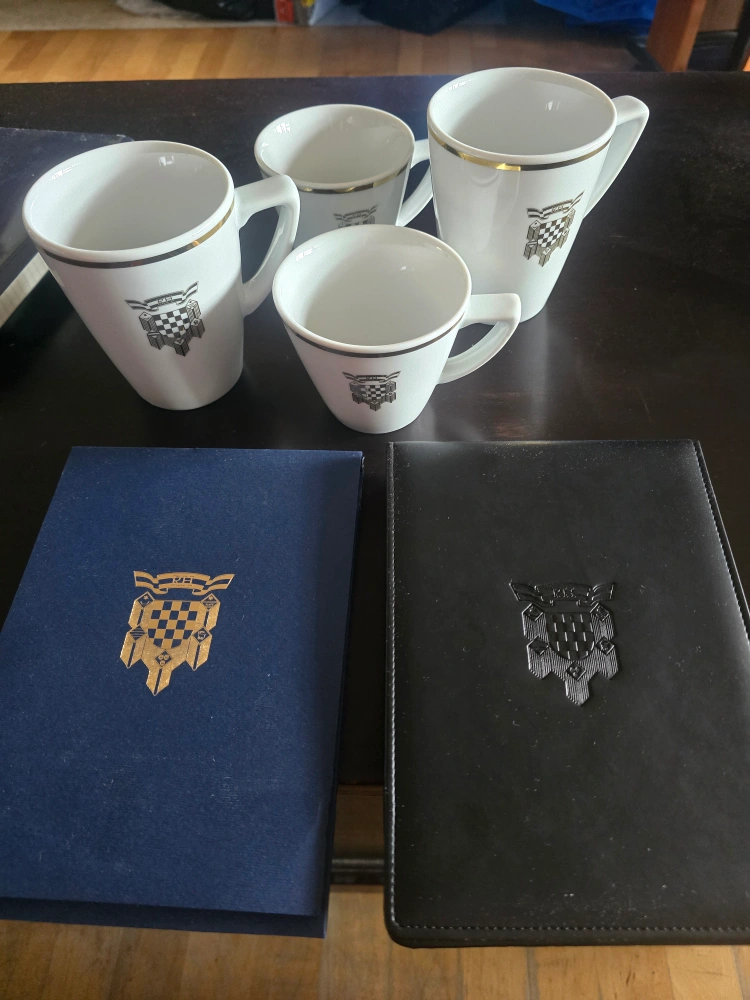 Selling one of a kind, Croatian presidential mugs and stationery. The mugs are white with a gold trim and a crest design. The stationery set includes a pen and paper with the matching crest design. Great for a collector!