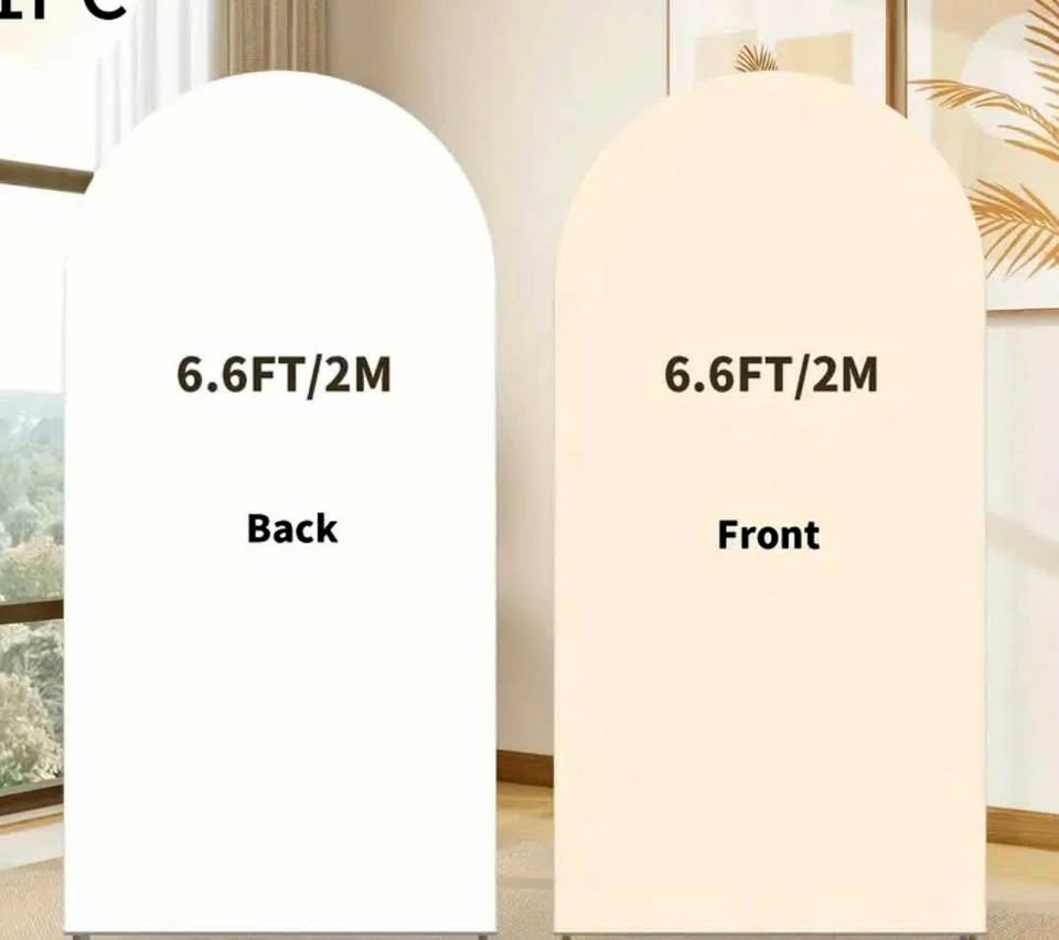 Gold balloon arch with double sided blank cloth cover in beige and white (beige side shown used in photos). The wording was done with a removable sticker. Easily tightens with a few clothespins. Arch disassembles so it is compact and easy to store. Perfect for photo backdrops at parties.