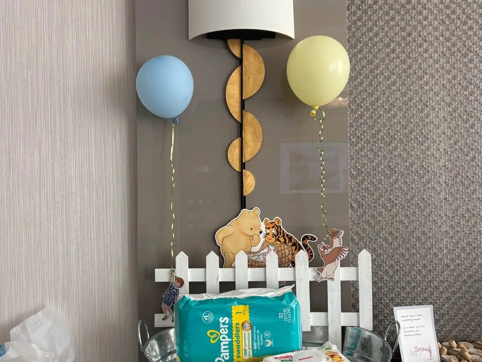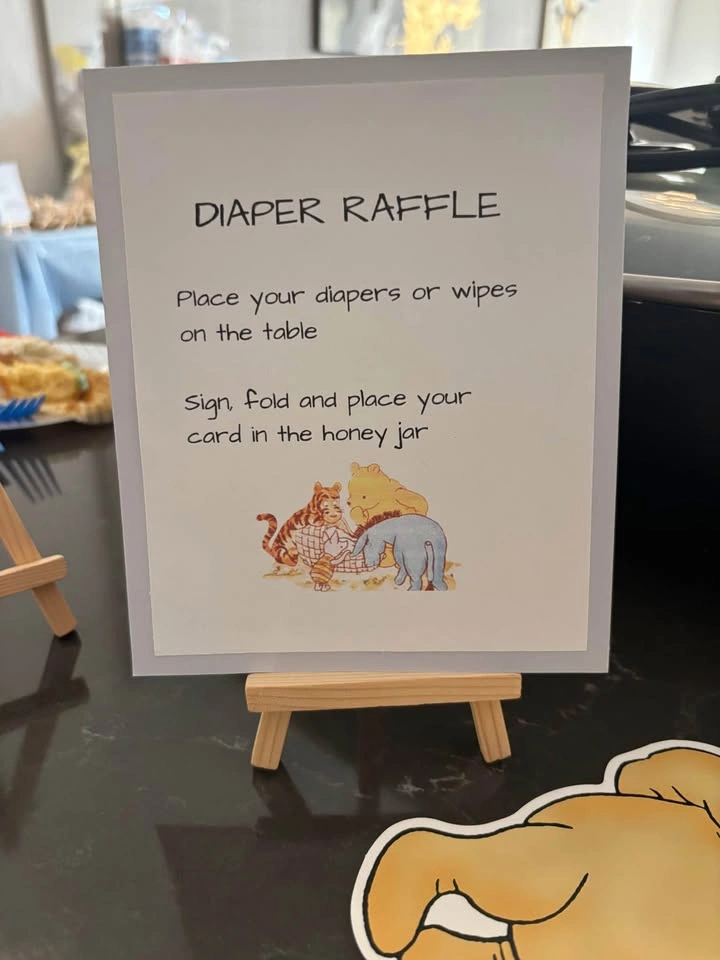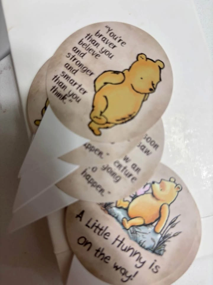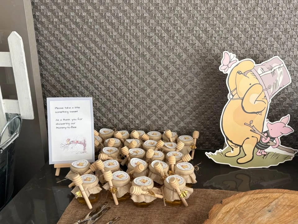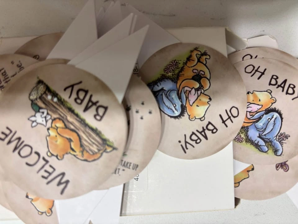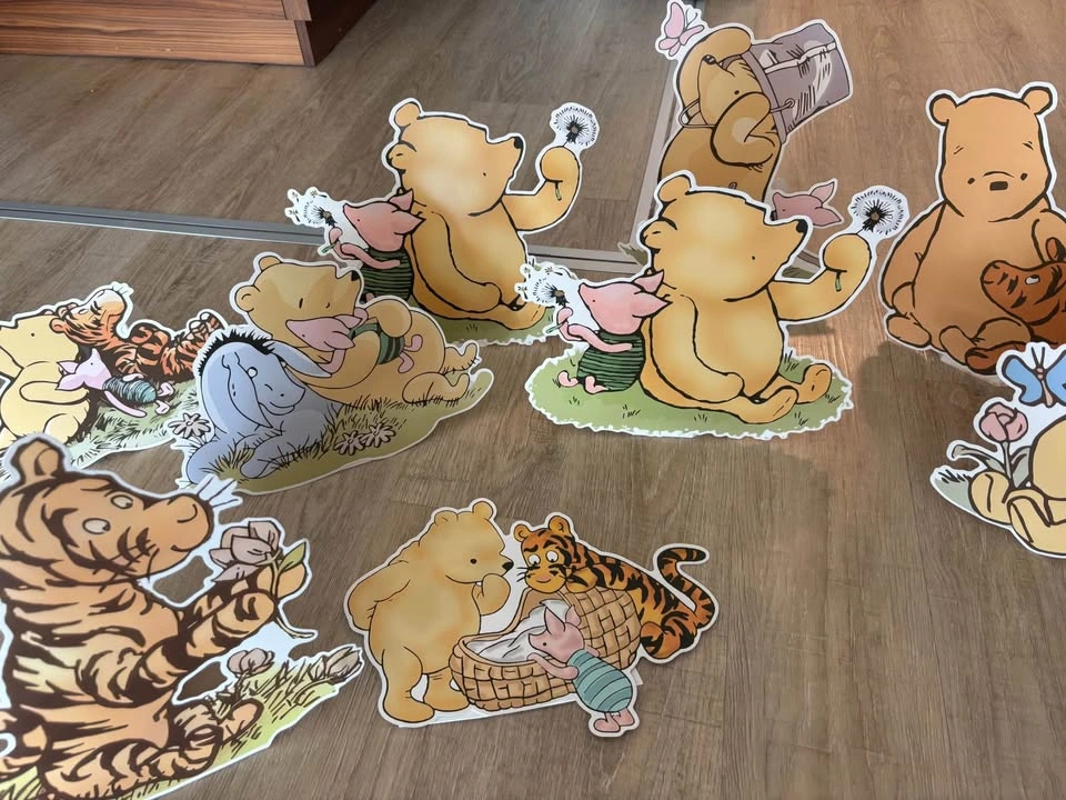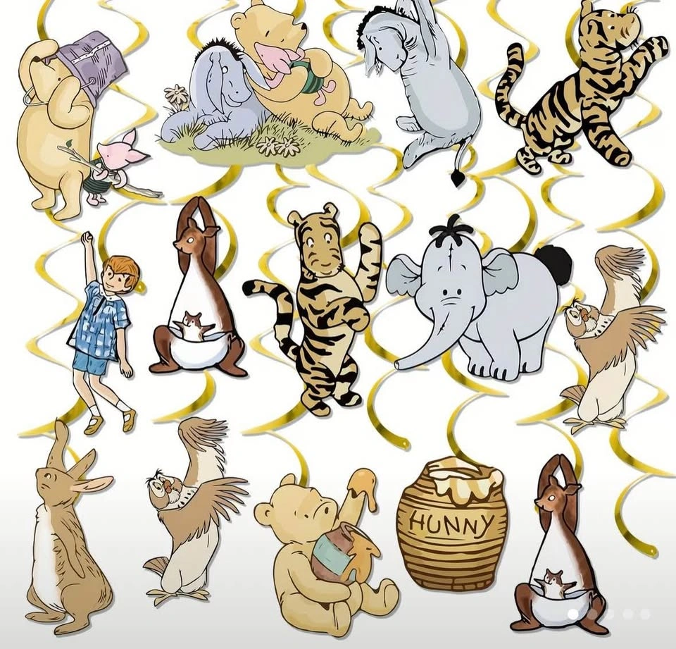 24 inch Winnie the Pooh cutout (1) Assorted Winnie and Friends Cutouts with Stands (approx 8 inches) Assorted mini Winnie and Friends cutouts used for the characters hanging from balloon decor (a few broke and I disposed of the spirals) Winnie and Friends cupcake toppers 2 Hunny pots Happy to include mini easels, signs and picket fence if requested