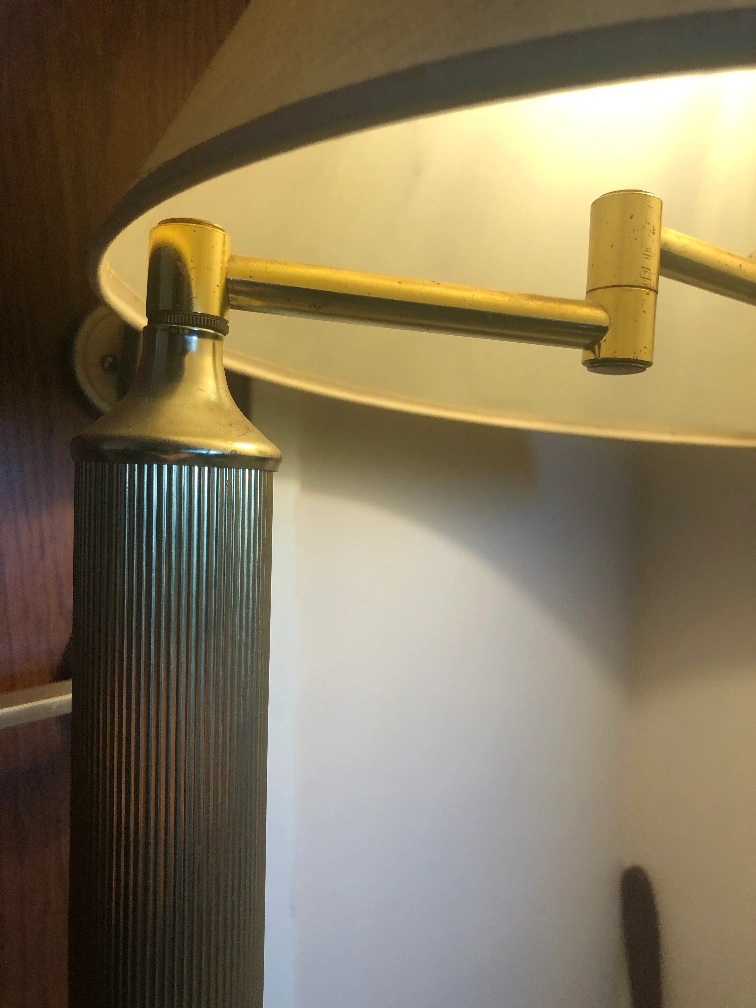 Selling a gold-coloured floor lamp! It has a neutral-toned lampshade and a sturdy base. Perfect for adding a touch of elegance to any room