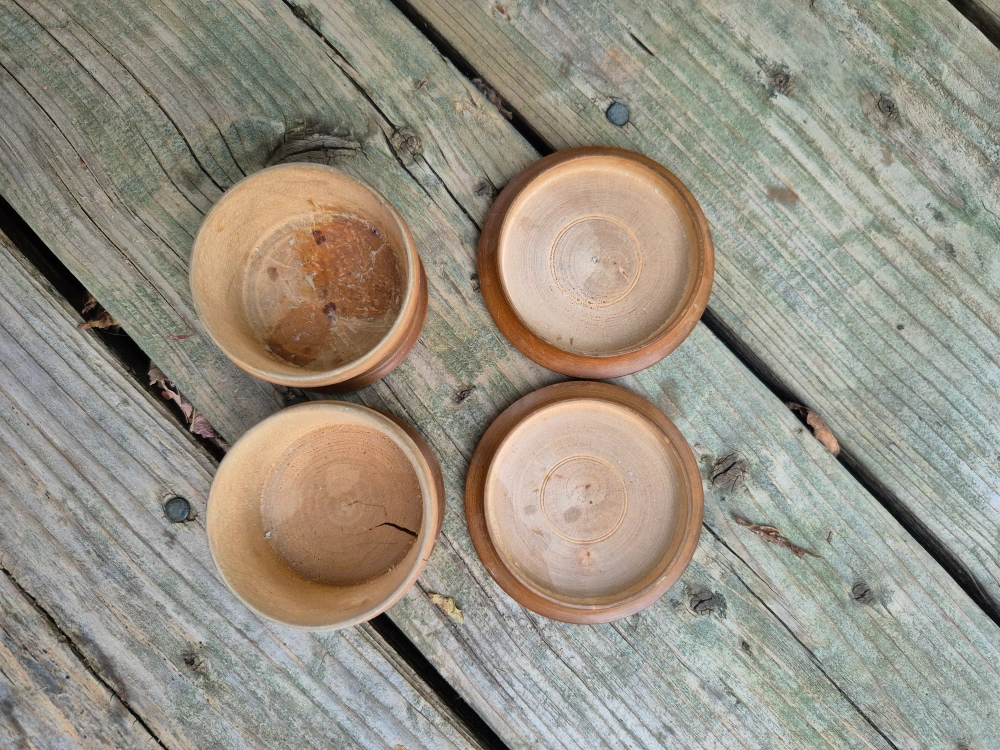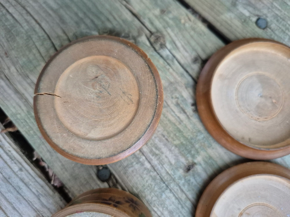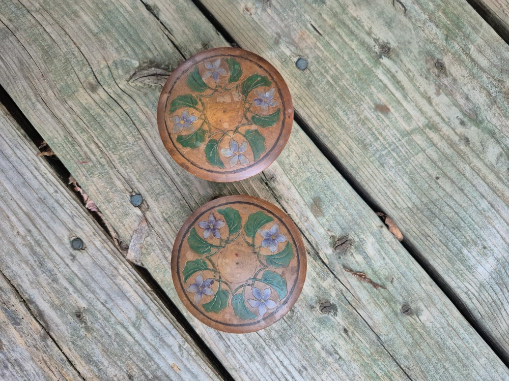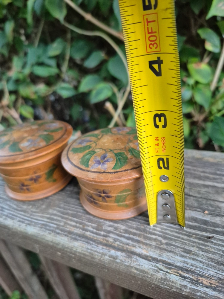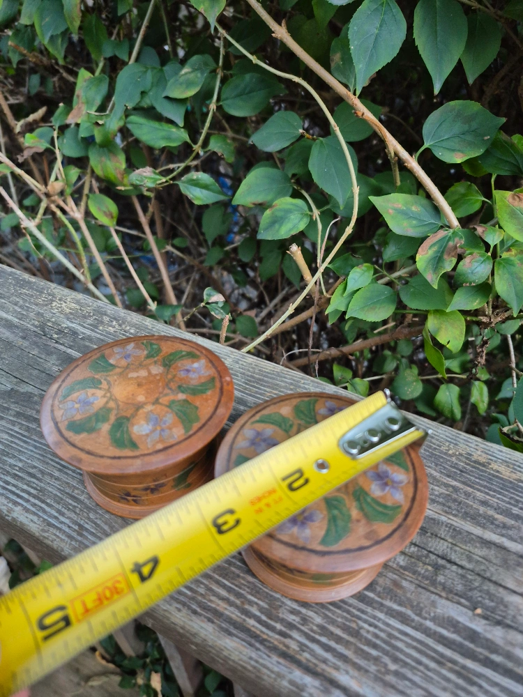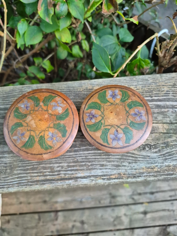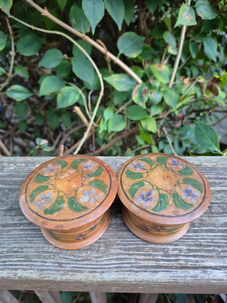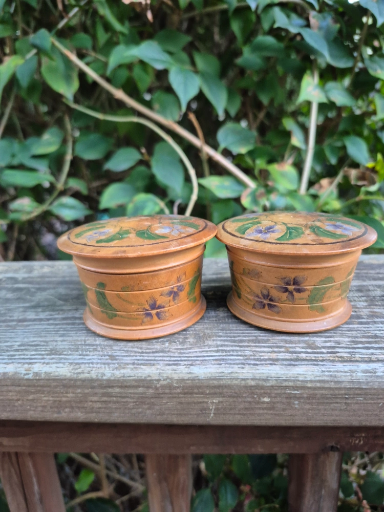 Selling a set of two hand-painted wooden boxes. They are decorated with floral designs. There are cracks in the wood. Sold as is.Each box is approximately 3 inches in diameter and 2 inches in height, perfect for storing small items. The price is $5 total for both. Pick up only no meet-up. Main and Danforth East York Woodbine/ Lumsden Cash only