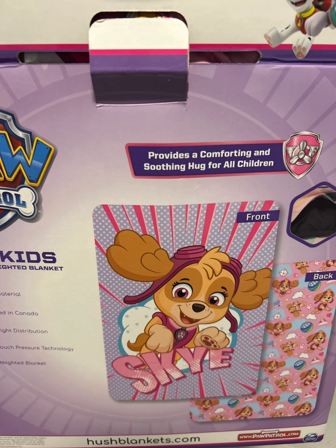 Keep your little one comfy with this Paw Patrol Skye weighted blanket from Hush Kids! It provides a comforting and soothing hug for all children. The blanket features Skye on the front and a pattern of Skye and other Paw Patrol elements on the back. Perfect for nap time or bedtime!
