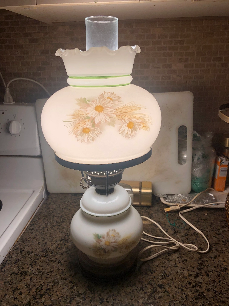 Selling a vintage milk glass lamp with a lovely floral design. It has a charming, classic look. Perfect for adding a touch of warmth to any room!